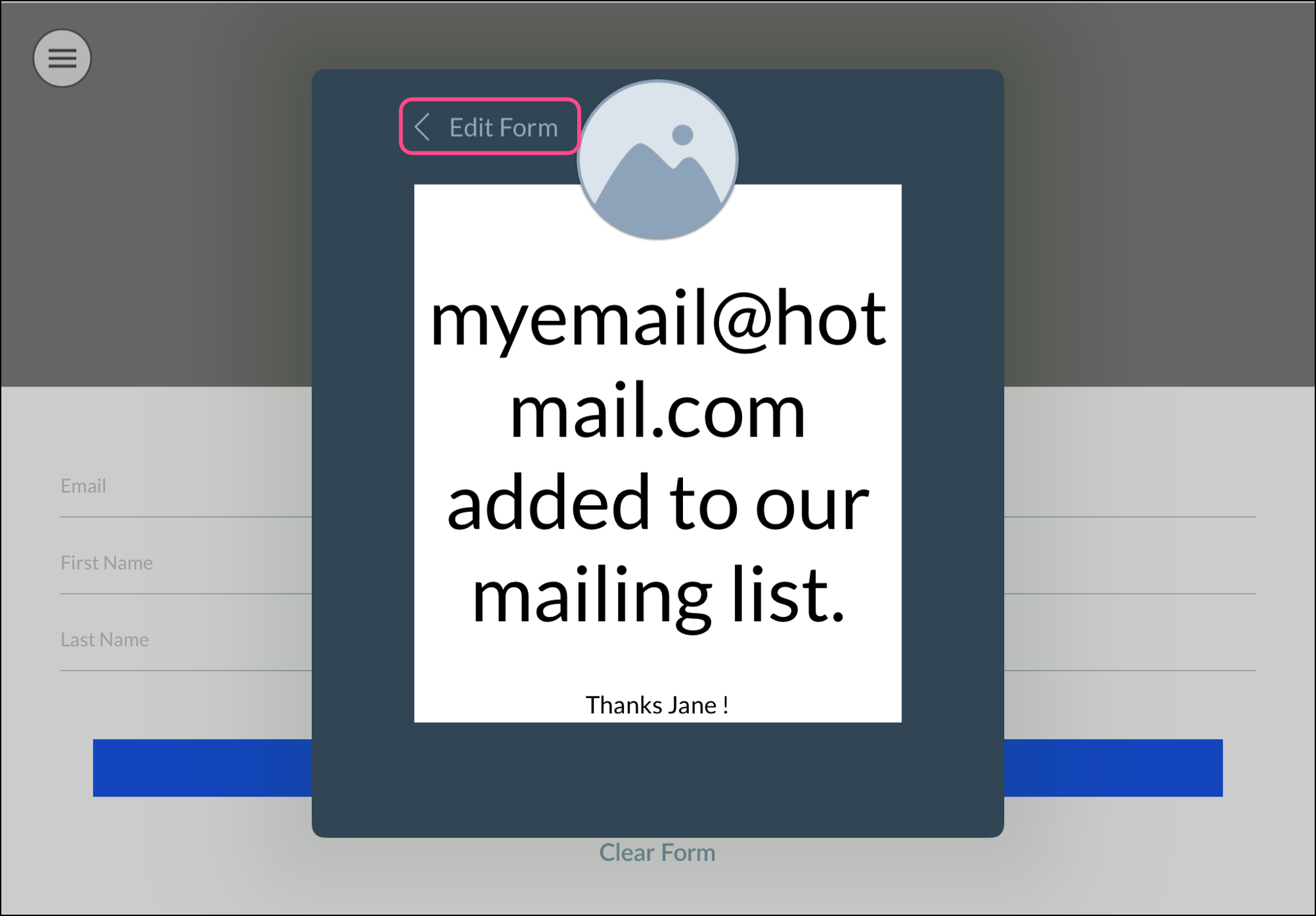 - Your new subscriber is presented with confirmation that their email address has been added to your list. Click "Edit Form" in the upper left-hand corner to return to the sign-up form for the next person.