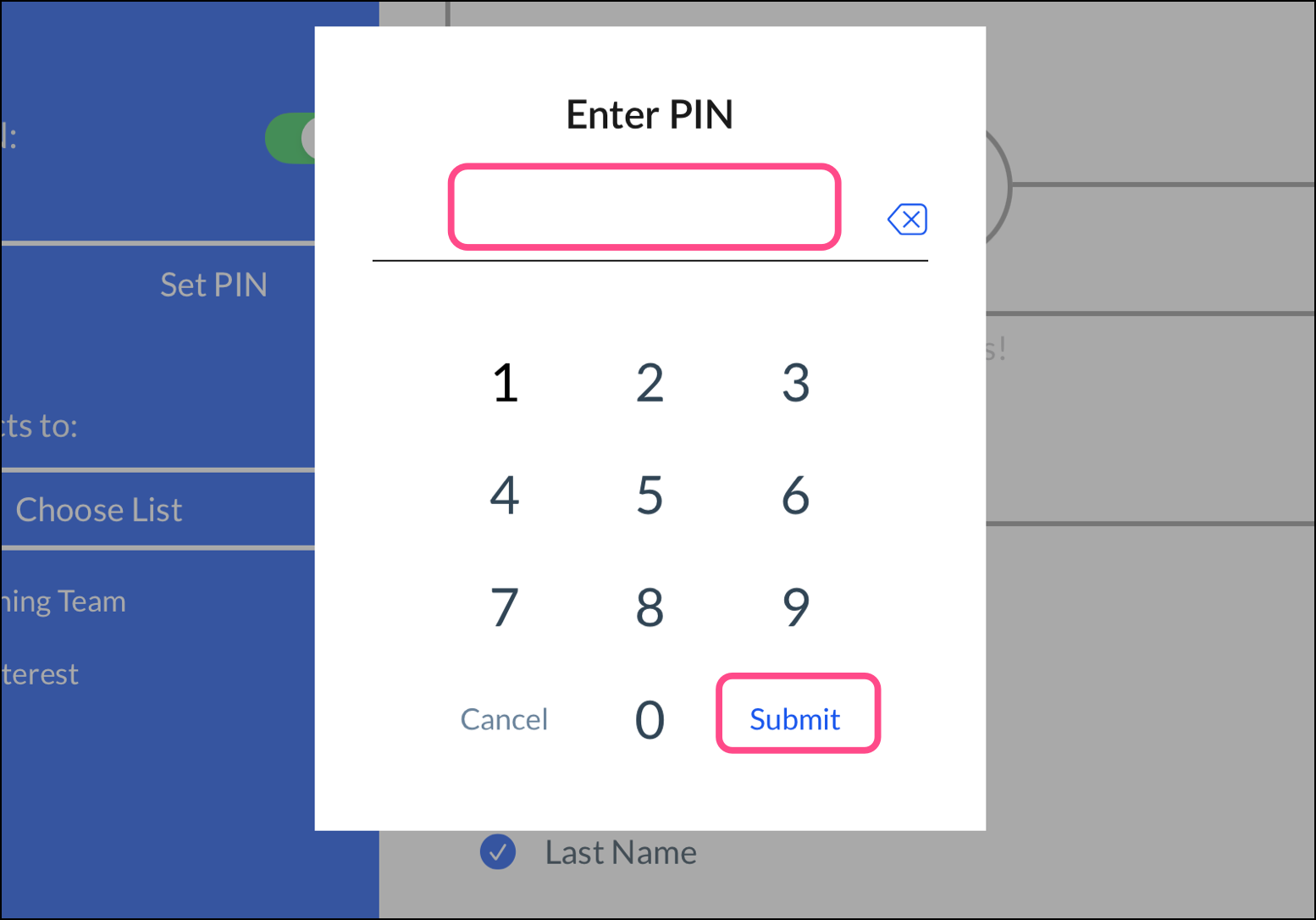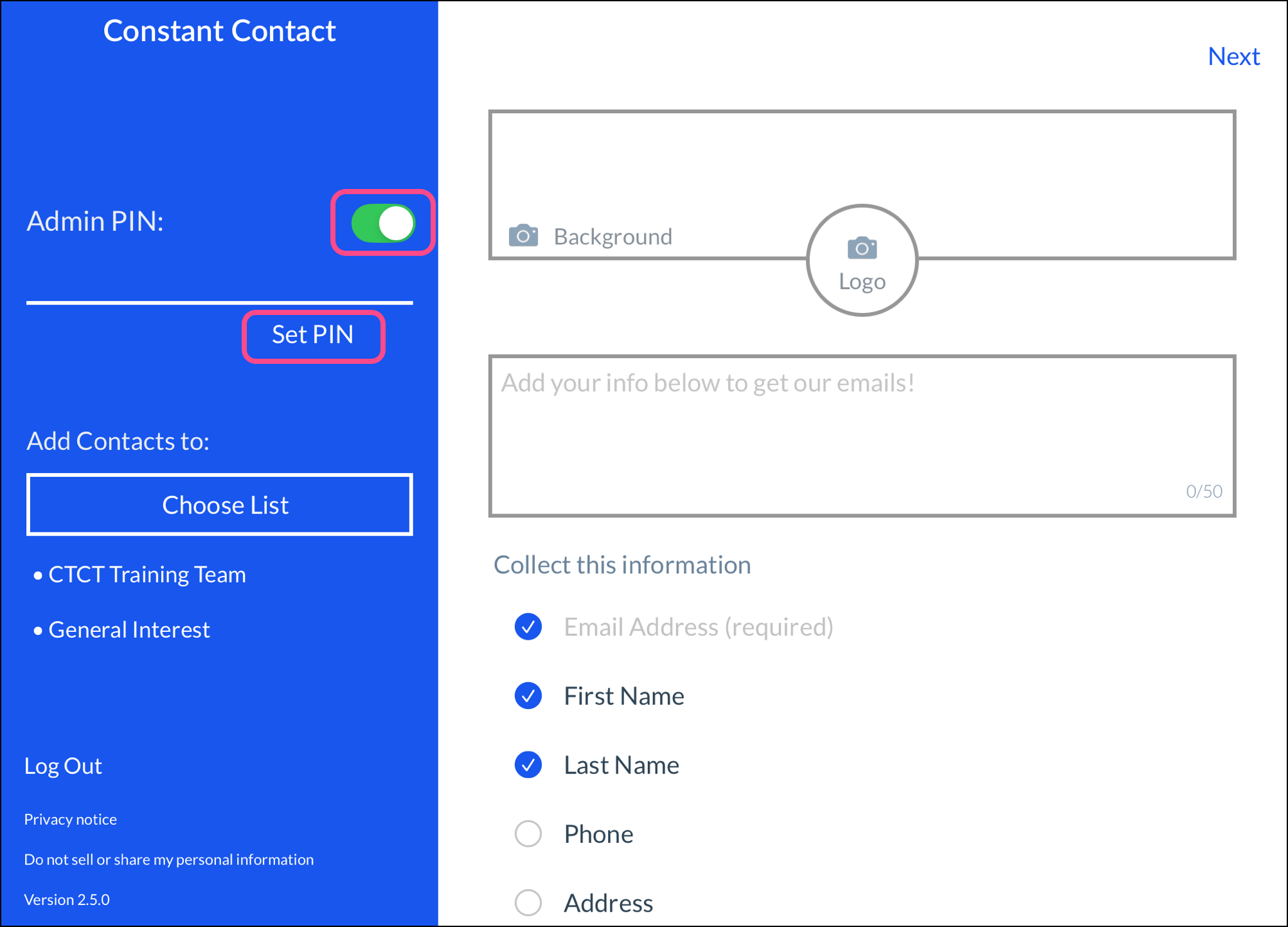 - (Optional) Tap the Admin PIN toggle to set a four-digit Personal Identification Number (PIN). This PIN prevents your sign-ups from leaving the sign-up form and accessing the settings for the ListBuilder app. The PIN doesn't prevent the app from being minimized to access other apps on your tablet.