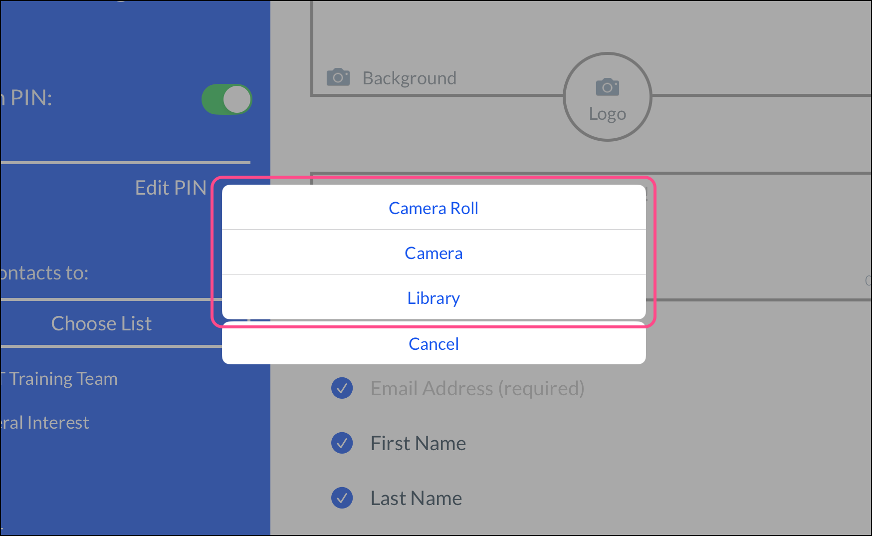 Repeat the process until you have uploaded both a Background image and a Logo image. To remove an image, tap the Background or Logo space and select Remove Image.