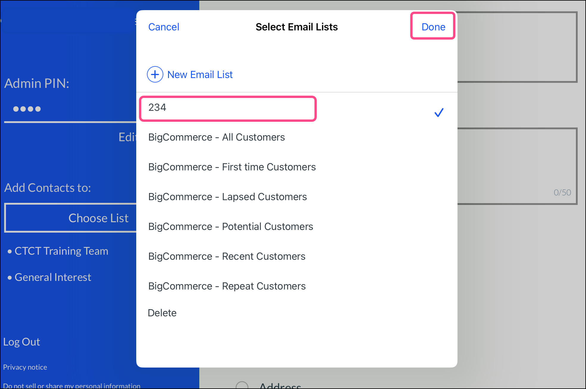 - Tap the lists you want to select, or tap + New Email List to create a new list for the occasion.