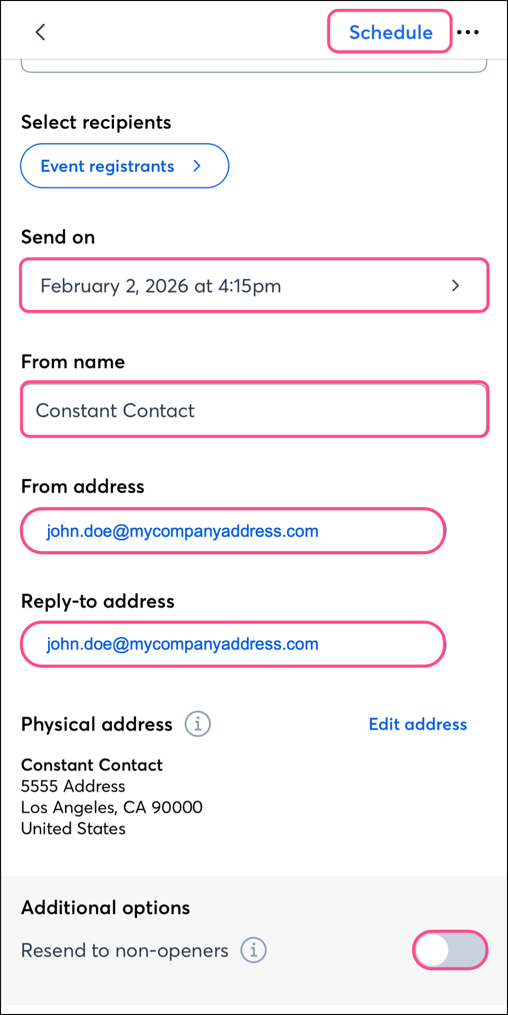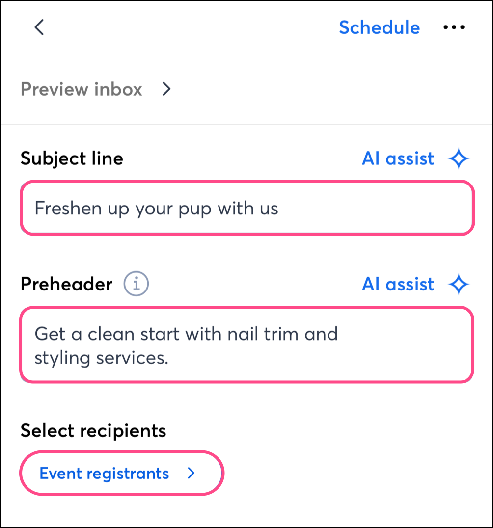 On Android or iOS, complete the following steps in Campaigns to schedule and send an email: