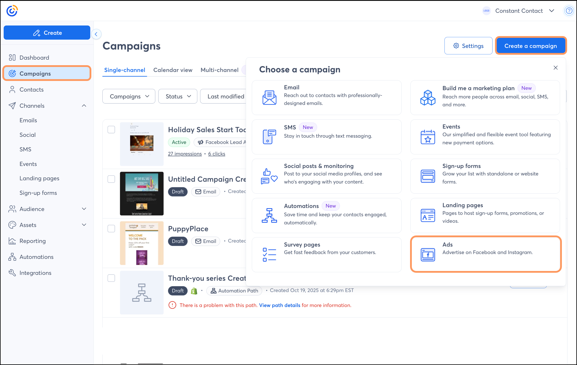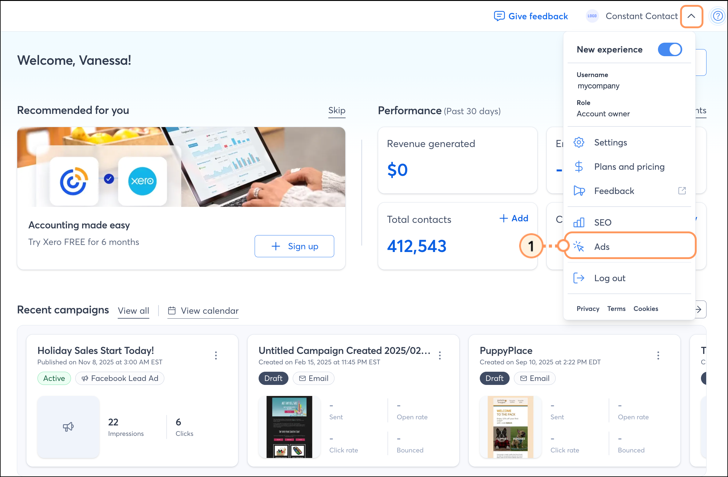 Nota: ¿No ve la opción Ads (Anuncios) en el menú de su perfil? Para ir a la sección Ads (Anuncios), también puede hacer clic en Campaigns (Campañas), Create a campaign (Crear una campaña) y seleccionar Ads (Anuncios) del menú desplegable que aparece.