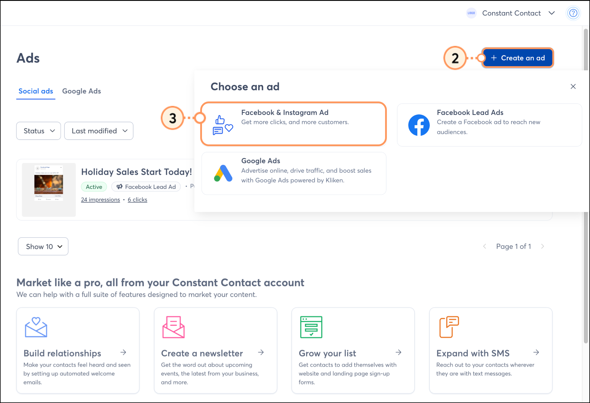 - Inicie sesión en su cuenta de Facebook para sincronizar su Página de Facebook y permítale a Constant Contact integrarse con su cuenta para crear anuncios. Esta acción no autoriza a Constant Contact a acceder a la información de su cuenta personal.