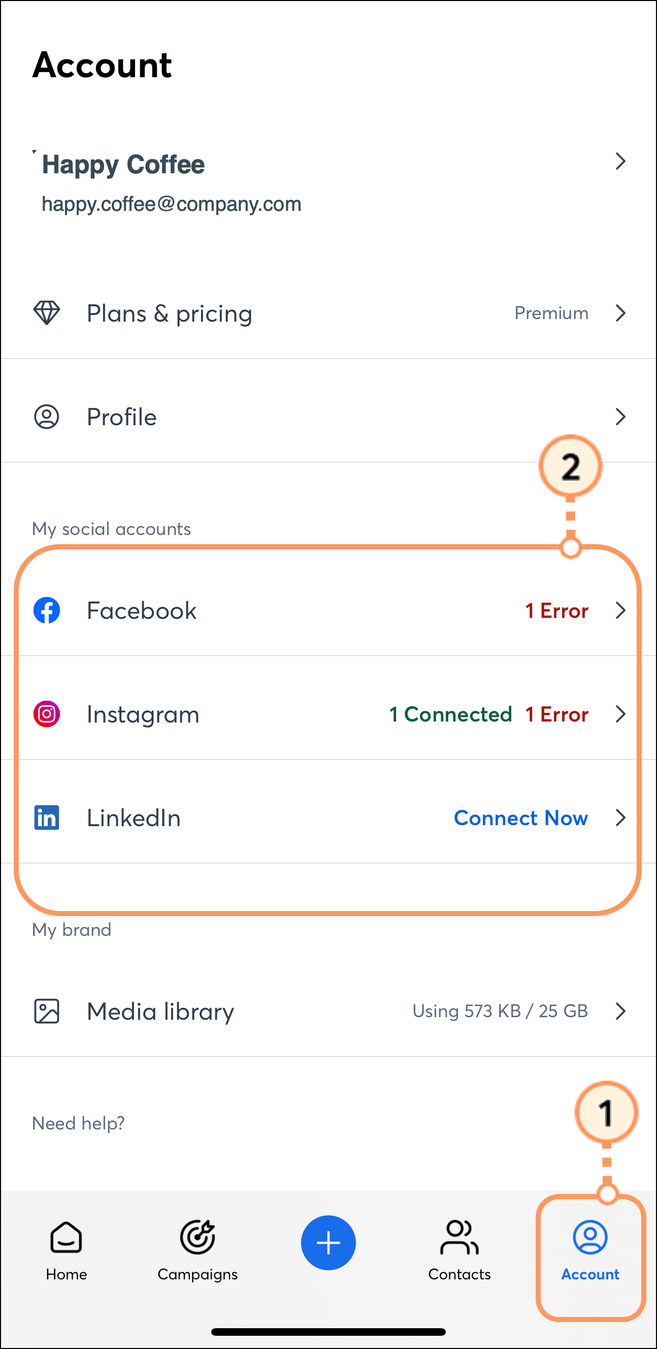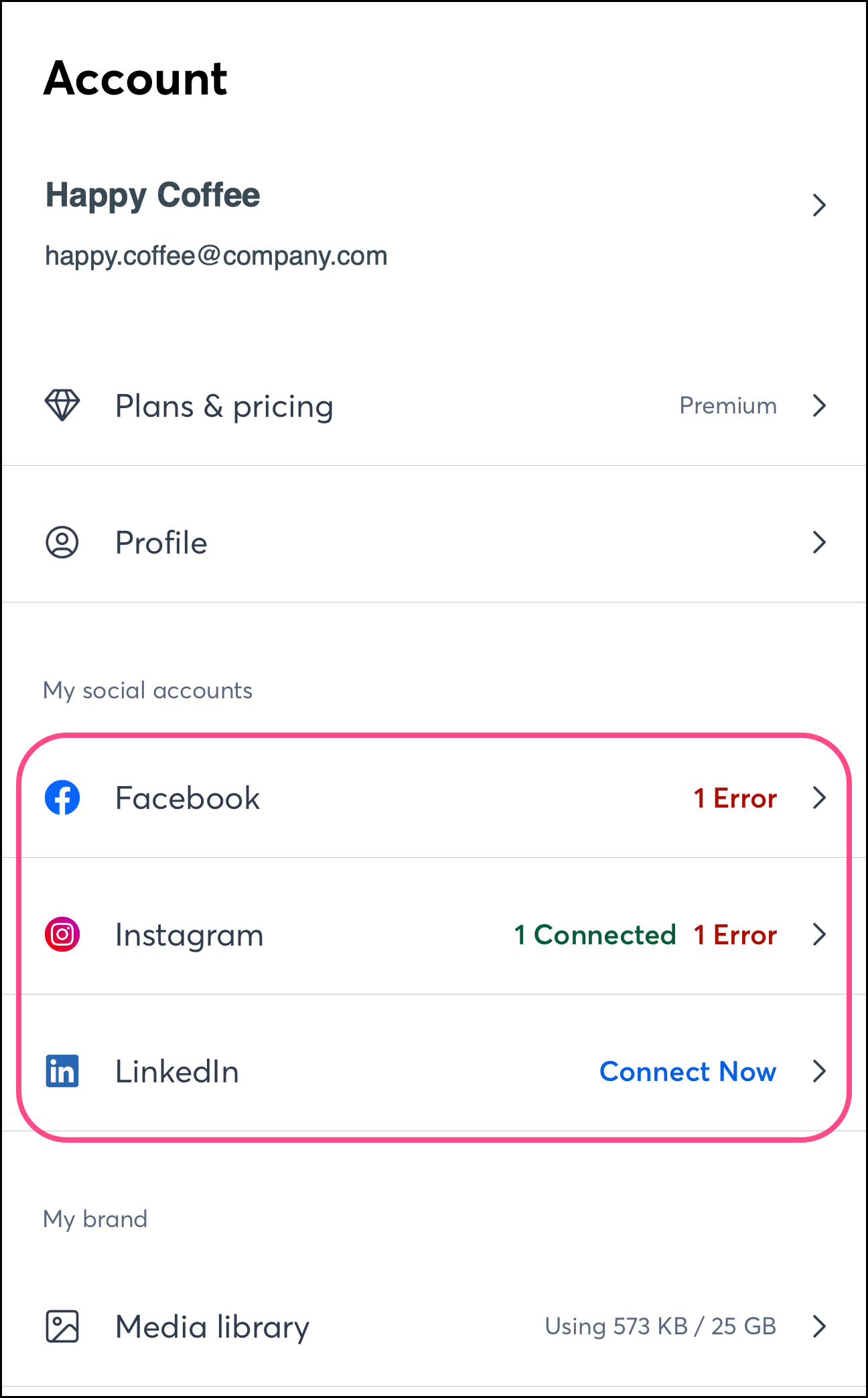 Once connected, you can see the status of your connected social media accounts from your profile page. If there are any errors with your social media connections, you’ll see an alert informing you to take the necessary steps to resolve the error.