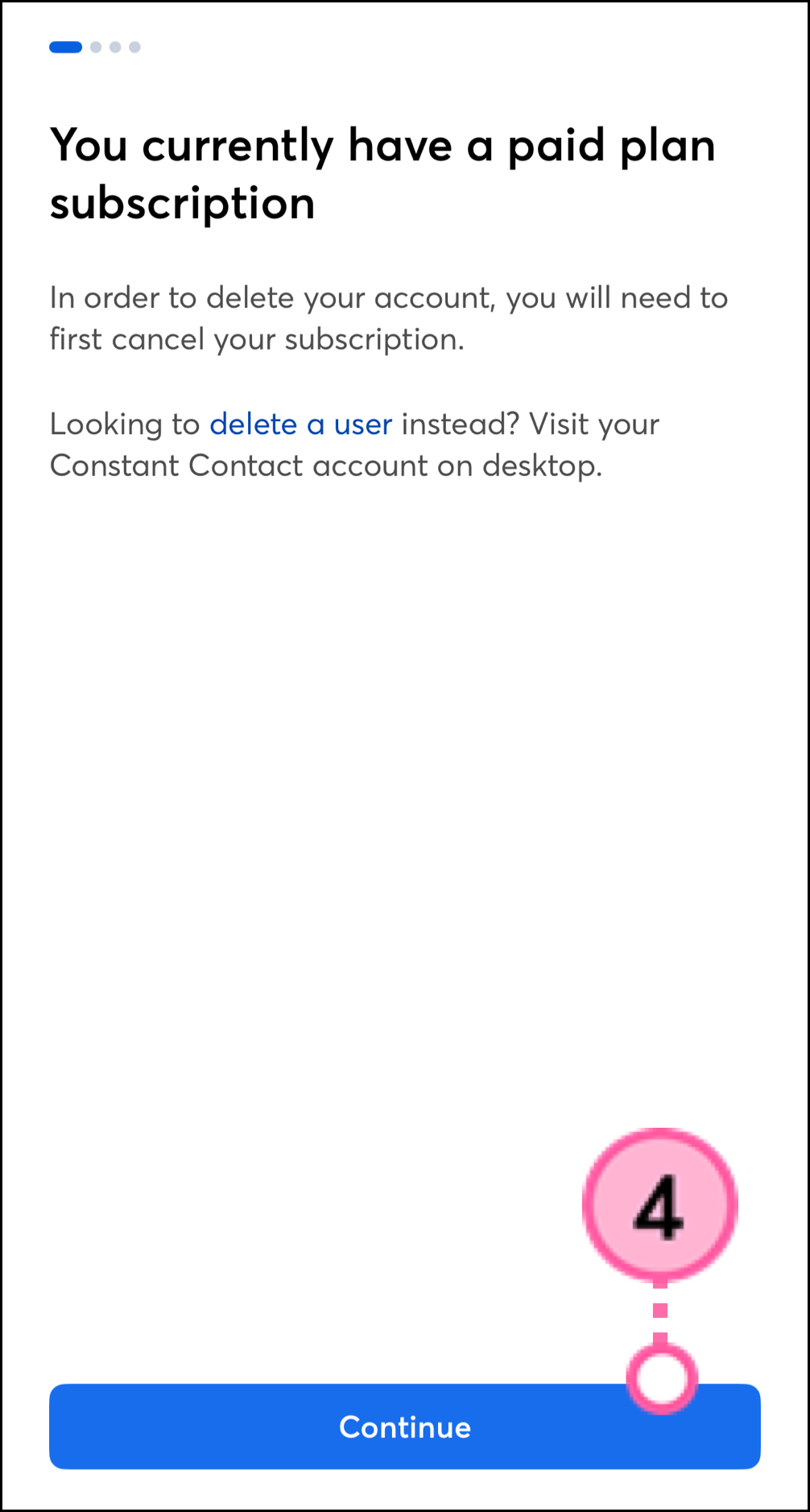 Follow the prompts on the screen to continue canceling your account. Your Constant Contact account will be canceled as of your next billing date. You can continue using your account until the specified cancellation date.