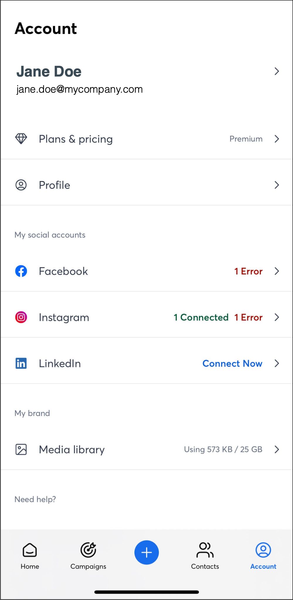 • Comparta un enlace a sus campañas enviadas en sus cuentas de redes sociales. La aplicación móvil ahora admite múltiples perfiles sociales dentro de una cuenta.