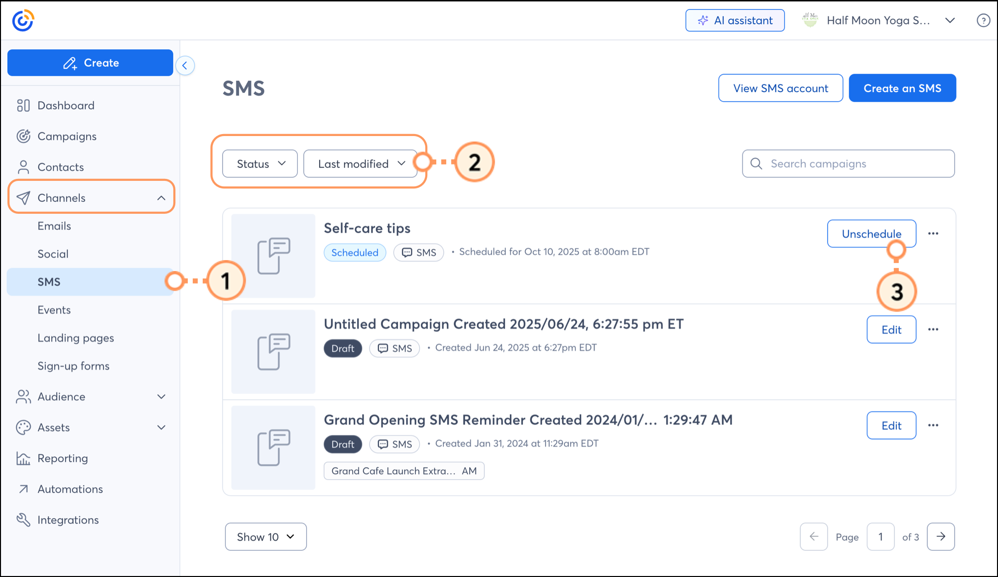 Your SMS campaign moves back into "Draft" status, and you can edit it or reschedule it at any time by clicking the Edit button next to the campaign.