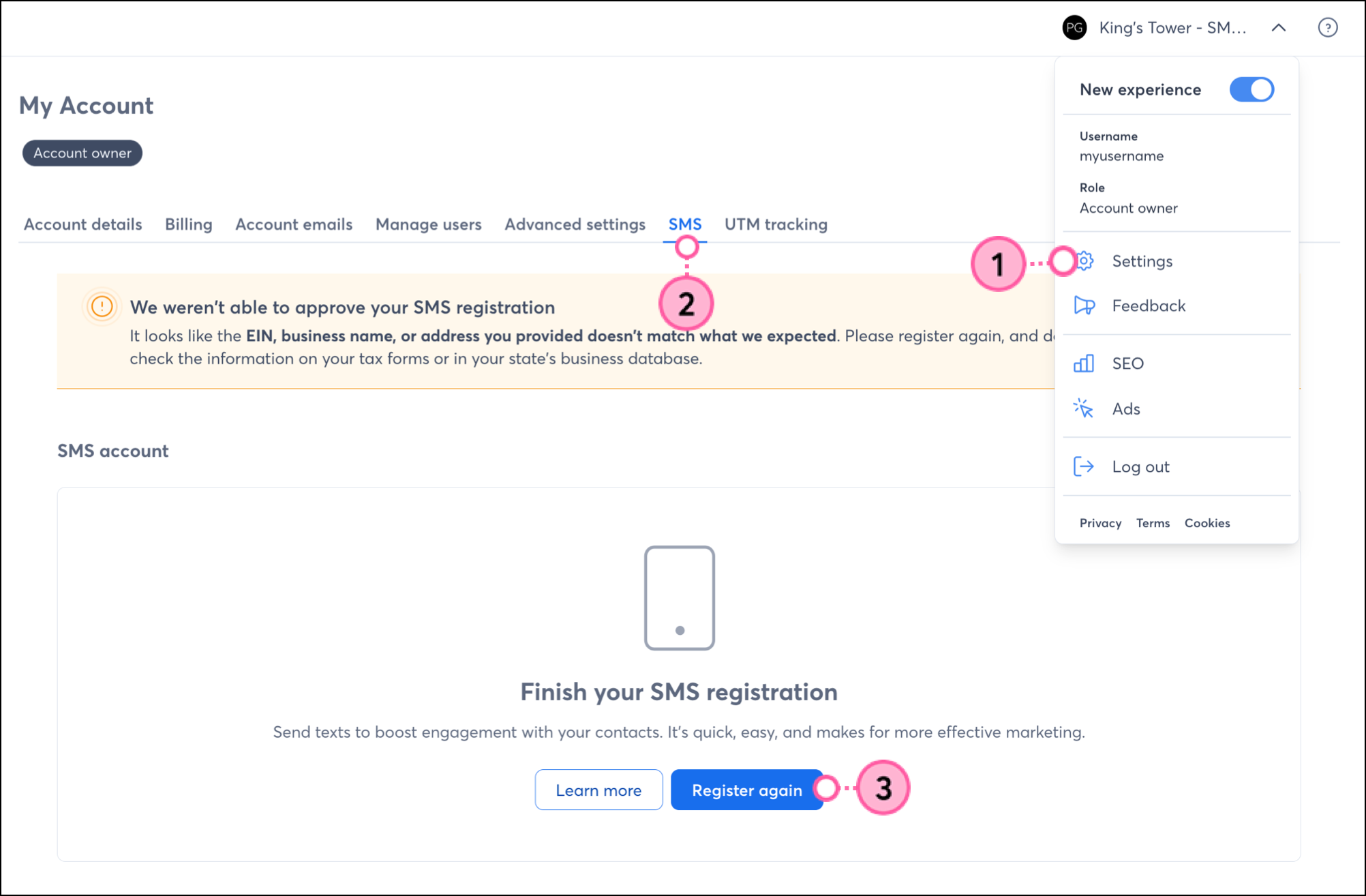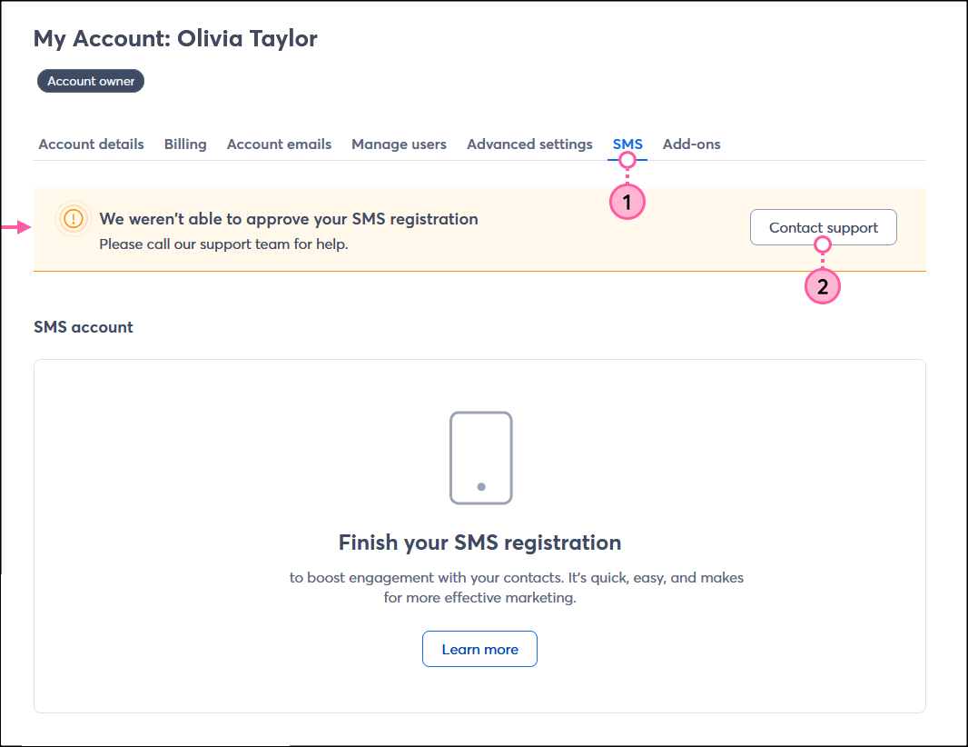 When your registration is rejected, a banner appears on the both the SMS tab in your account settings and on the SMS dashboard. To resolve the error, you have to re-submit the SMS registration.