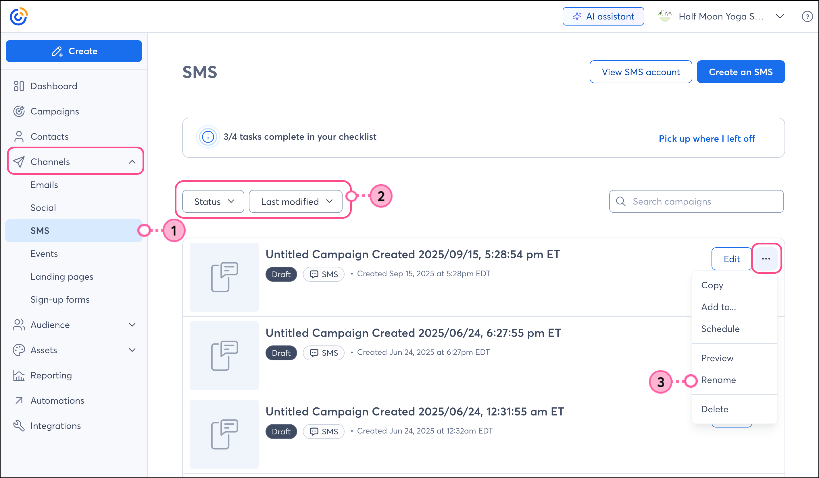 Cuando crea un mensaje SMS, el nombre se genera automáticamente, pero puede cambiarlo por el que quiera para ayudarle a encontrarlo más tarde en su cuenta. El nombre de su campaña por mensaje SMS es interno, por lo que los destinatarios no podrán verlo.