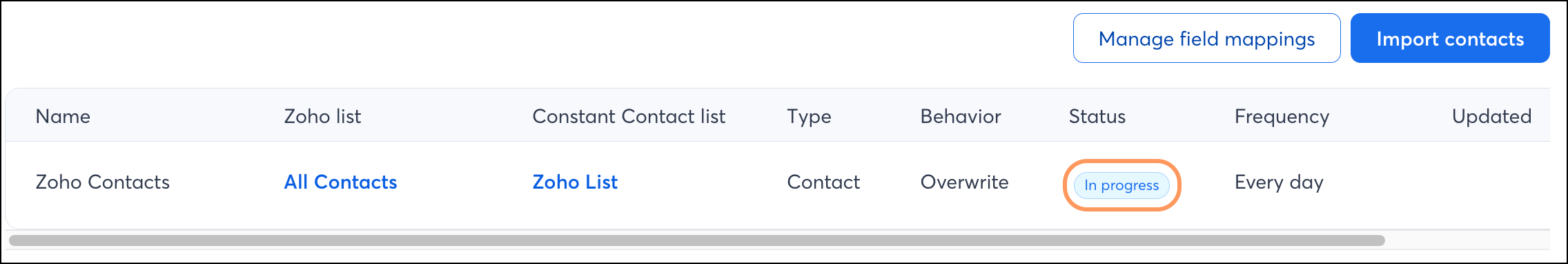 You'll be brought back to your Zoho integration dashboard, where you can see a list of all your imports, along with the status and details of each. When you create a new import, it will initially be listed in an In process status.