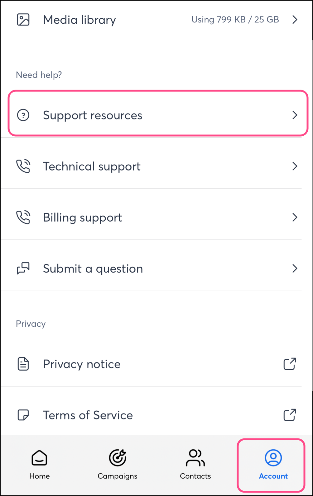 Tap on the Account tab from the app’s navigation menu and scroll down to "Need Help?".