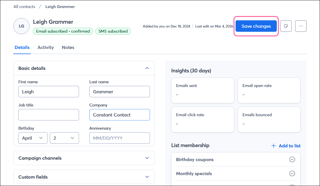 There is now a universal "Save" button at the top of each contact record. You no longer need to save each field's changes individually; make your changes as needed and save the entire record. Learn more.
