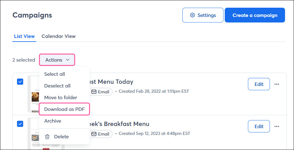 You can now download up to 10 emails, Custom Landing Pages, and Sign-up Landing Pages at a time as PDFs to save to your computer or print later—whether they're in draft status or have already been sent or activated. Learn More.