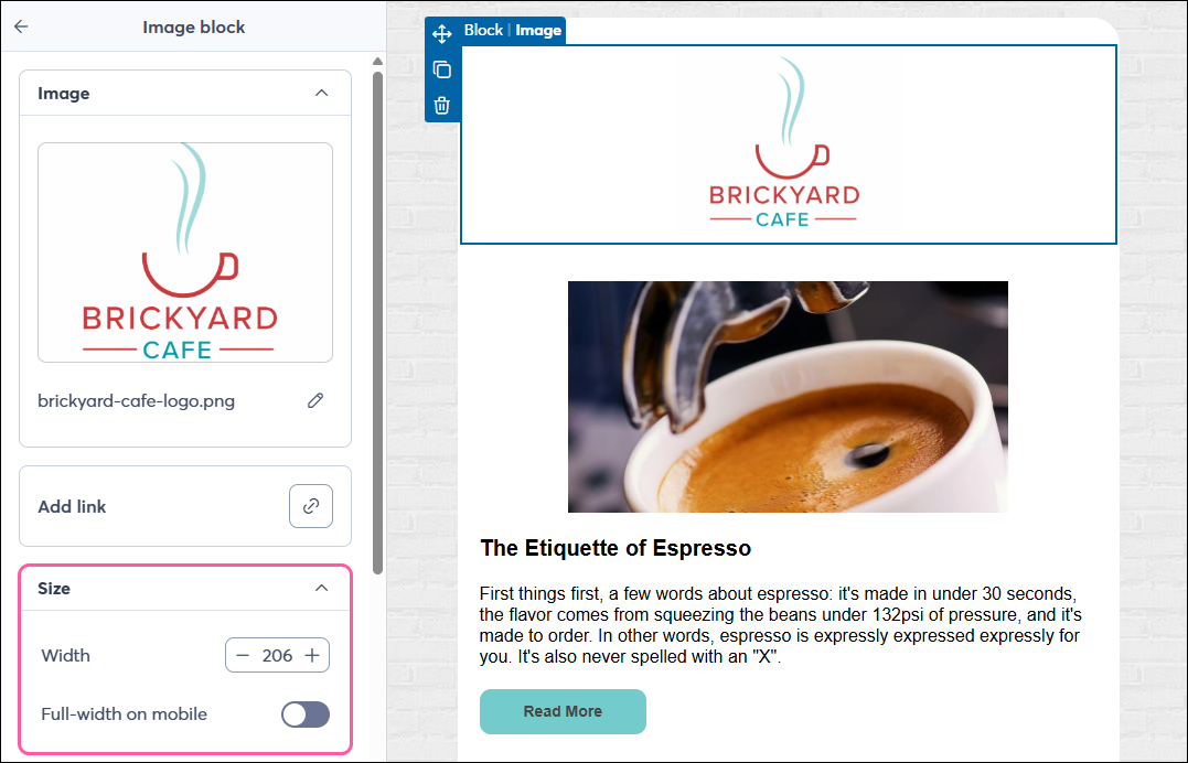 You can now set a specific pixel width for the images in your email, and choose if you want them to fill the full width of the screen when your email is viewed on a mobile device—giving you more control over how your email looks on all devices. Learn more.