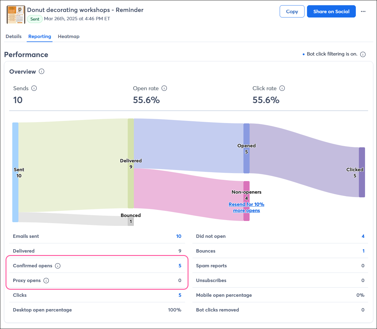 We've optimized the way 'proxy' and 'confirmed' opens are displayed to make it easier to evaluate your true open rate on the email details page and in email reporting. If we can't be sure that a person did the opening, the open is categorized as a 'proxy open' and separated from your 'confirmed opens' for more accurate reporting. Learn more.