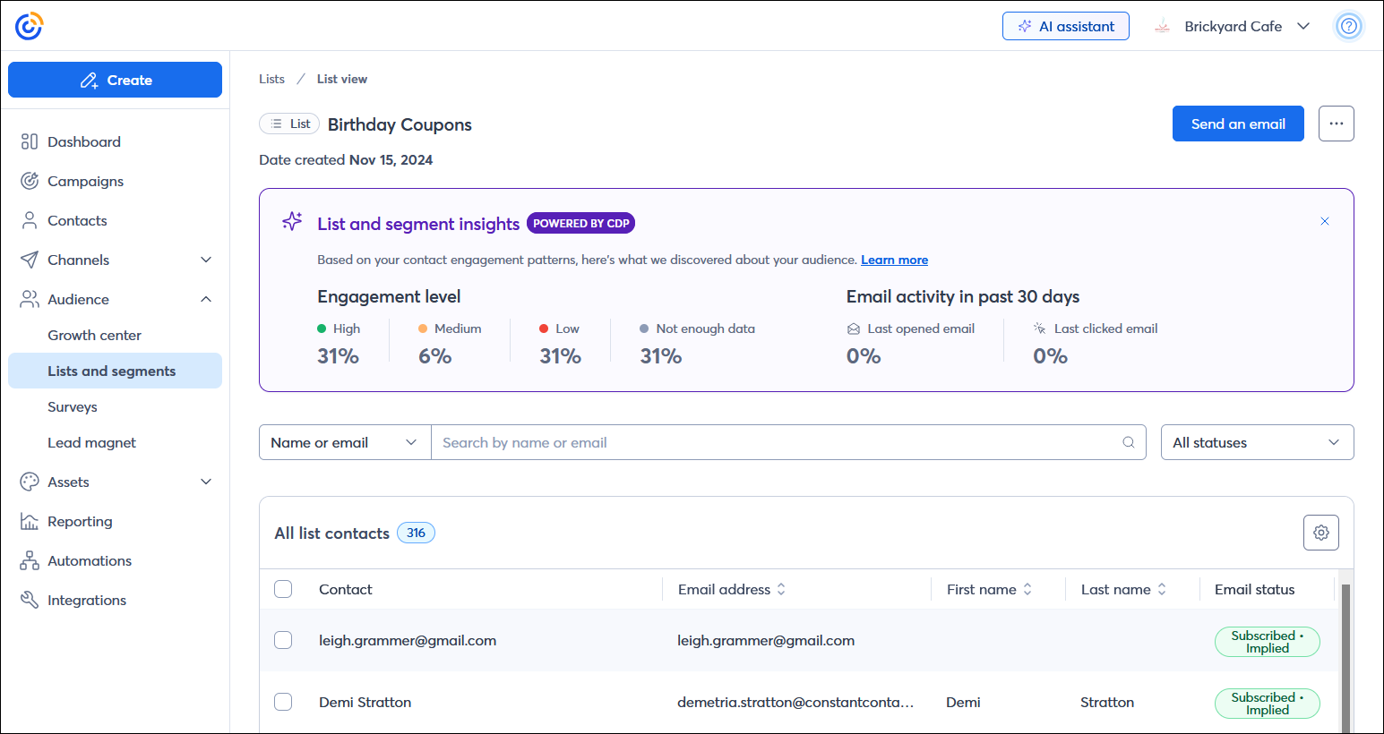 A new table of information can be seen at the top of the Lists and Segments page, giving you a high-level overview of contact insights. Click the insights link to see the full reporting. Learn more.