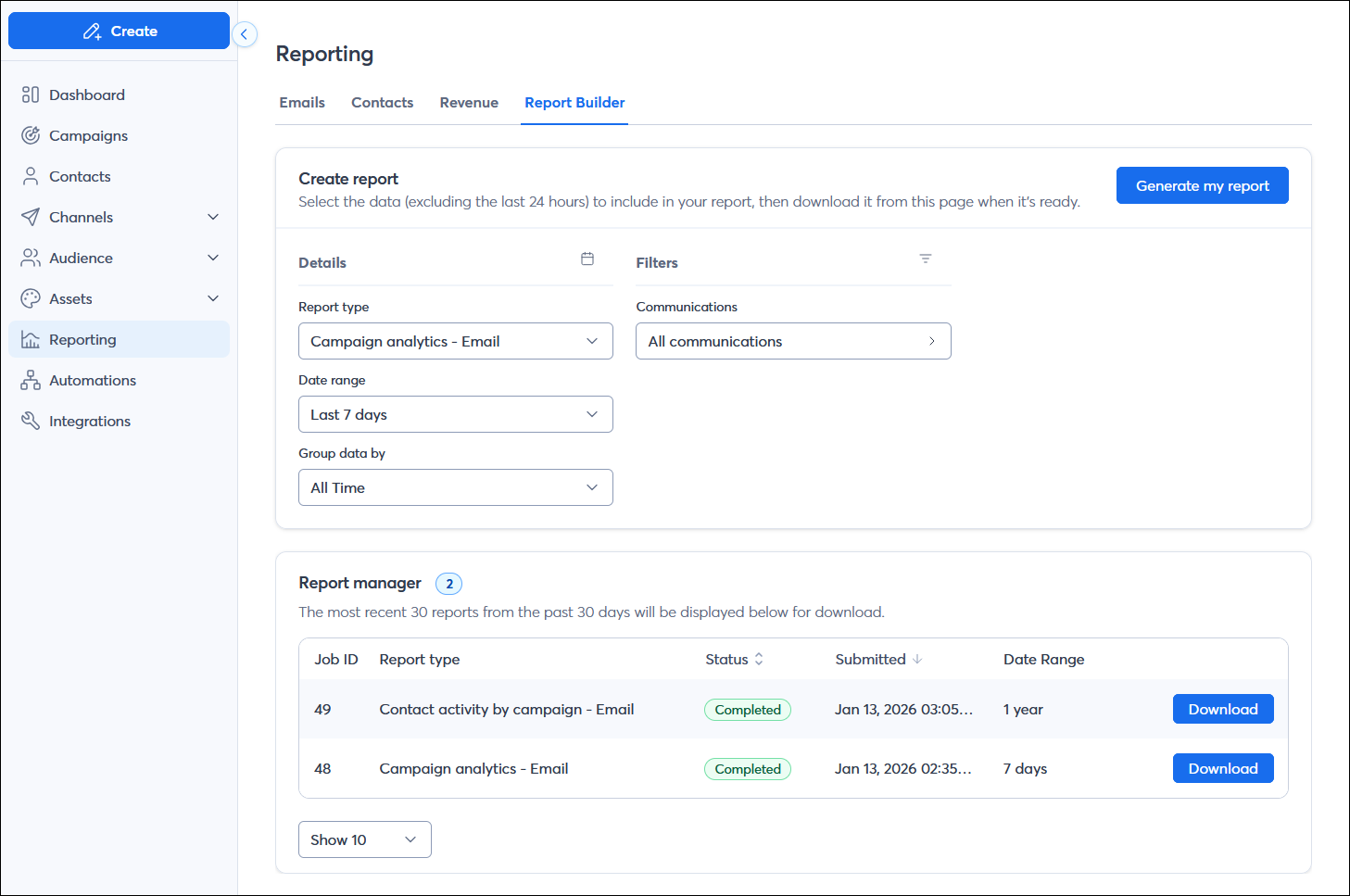 With the new Report Builder tab, in Reporting, you can now select the data you want to export. The report can be emailed to a verified email address when it's created or downloaded from the Report Builder tab after the report is complete. Learn more.