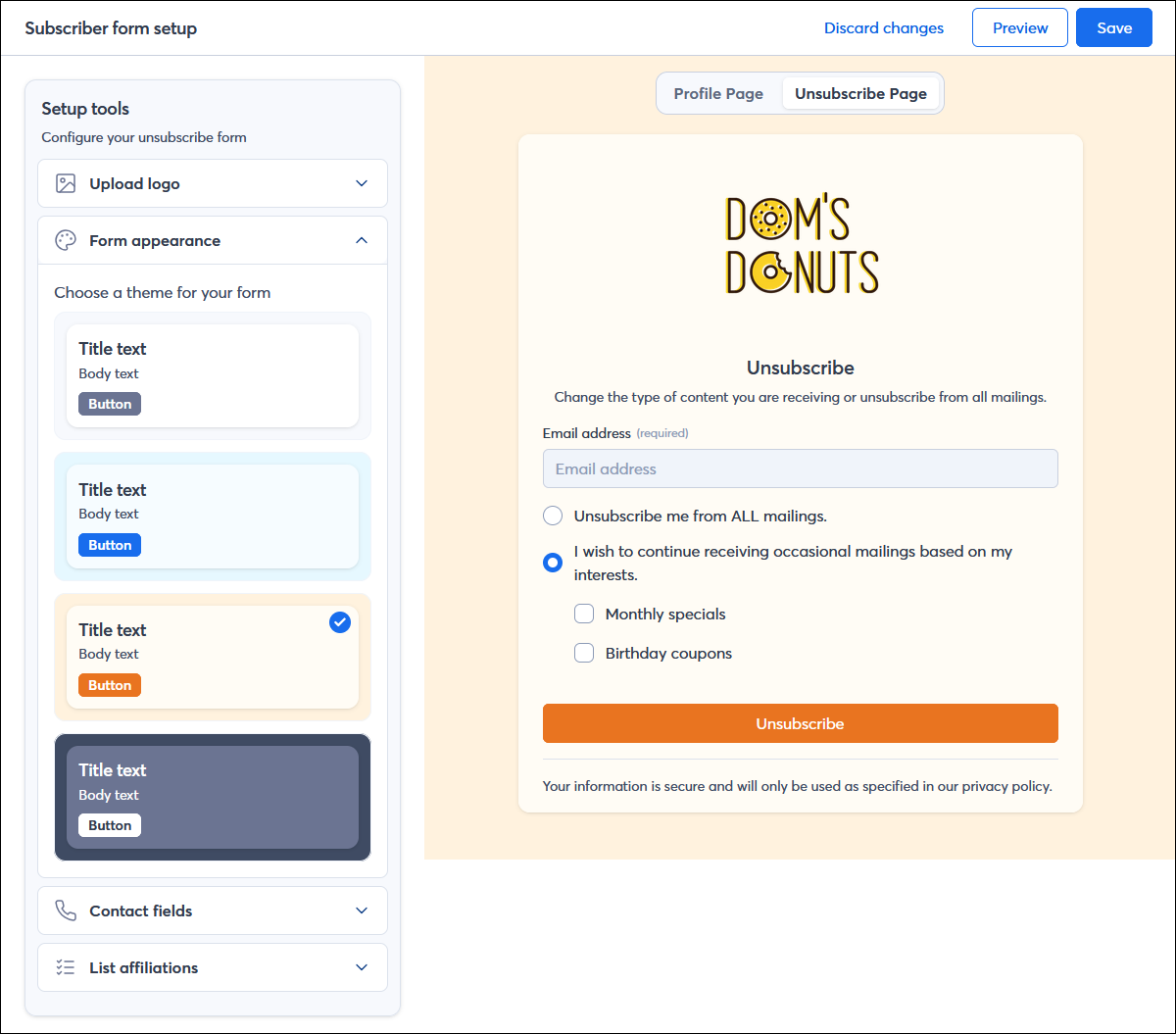 The Update Profile and Unsubscribe pages can now be modified from Advanced Settings within your Account Settings. Add a logo and select the lists from which contacts can opt out. Contacts can unsubscribe in a single action or choose specific lists. Learn more.