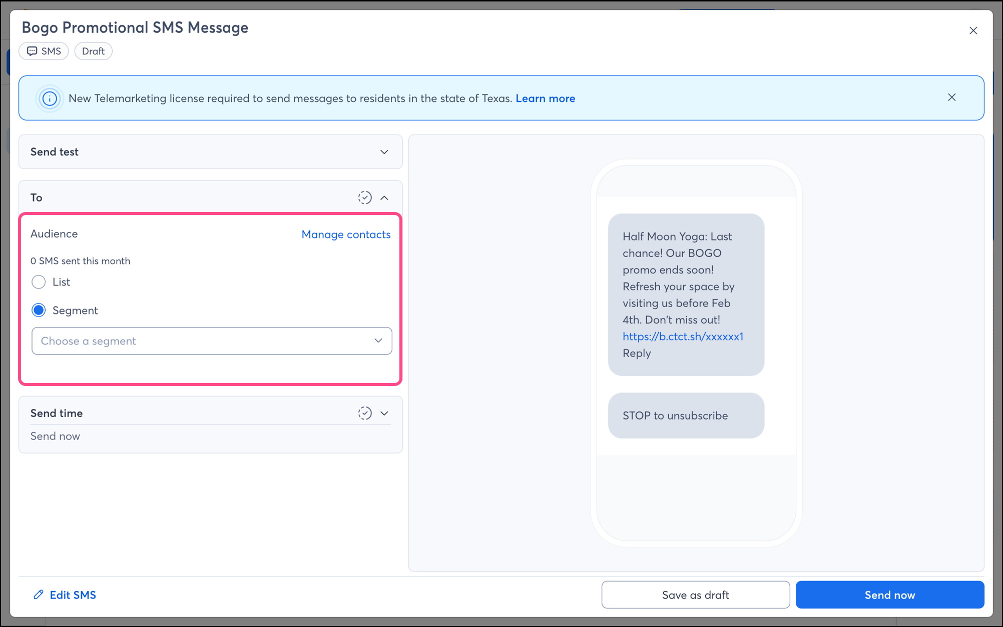 You can now send SMS messages to segments or to lists by selecting your choice in the Schedule Message pop-up window. Learn more.