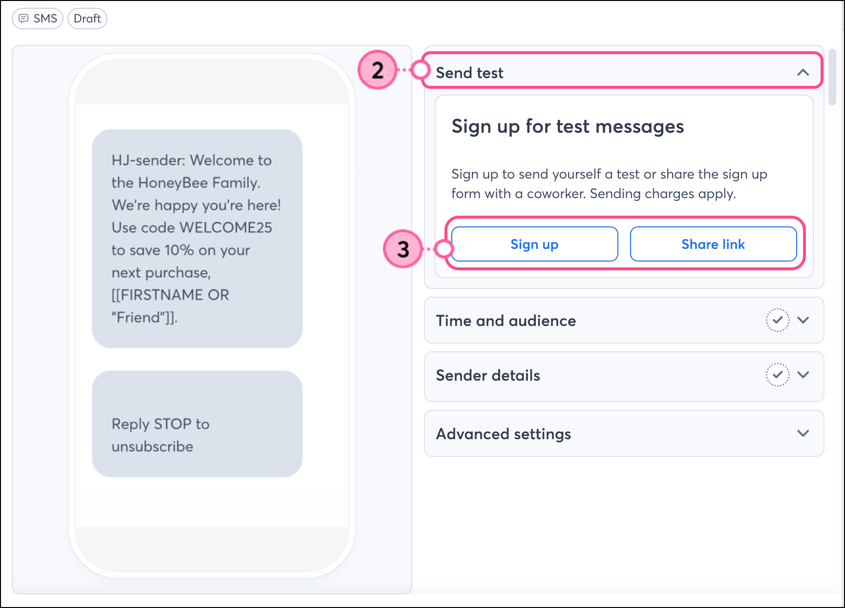 While our SMS preview feature gives you a quick look at how your messages will appear, you’ll only be able to see your variables and get a general idea of how your longer messages will be split. With a test send, you’ll see exactly what your contacts will experience before launching full campaigns.
