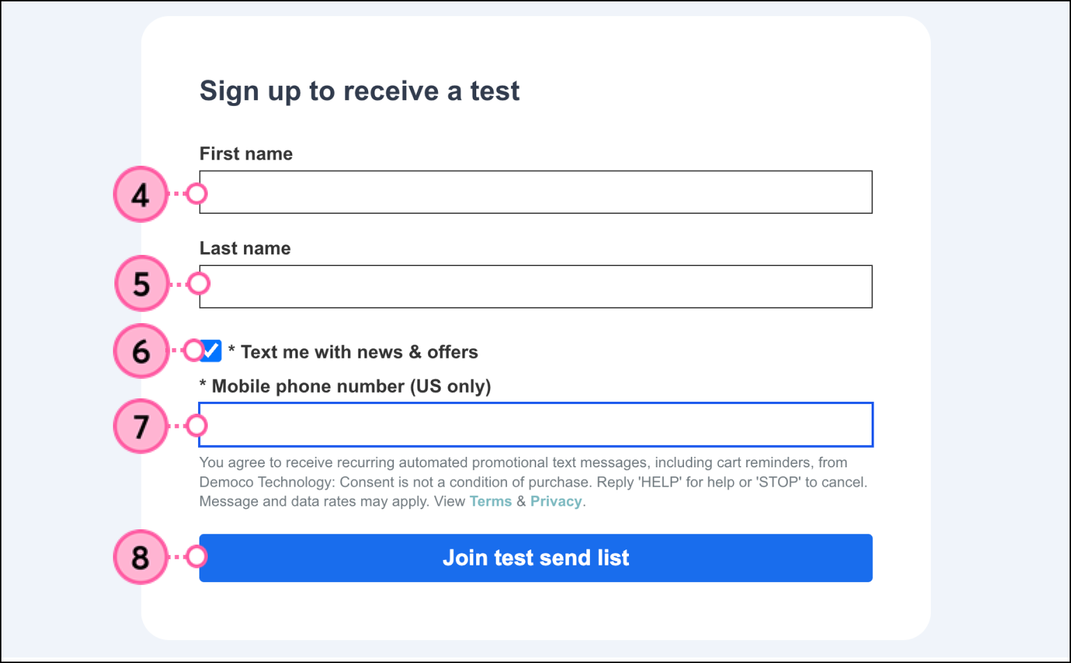 To complete a test send, you must have purchased the SMS marketing add-on and have completed the registration process. To send your first test, you’ll need to add a phone number and opt that number in to receive SMS messages.