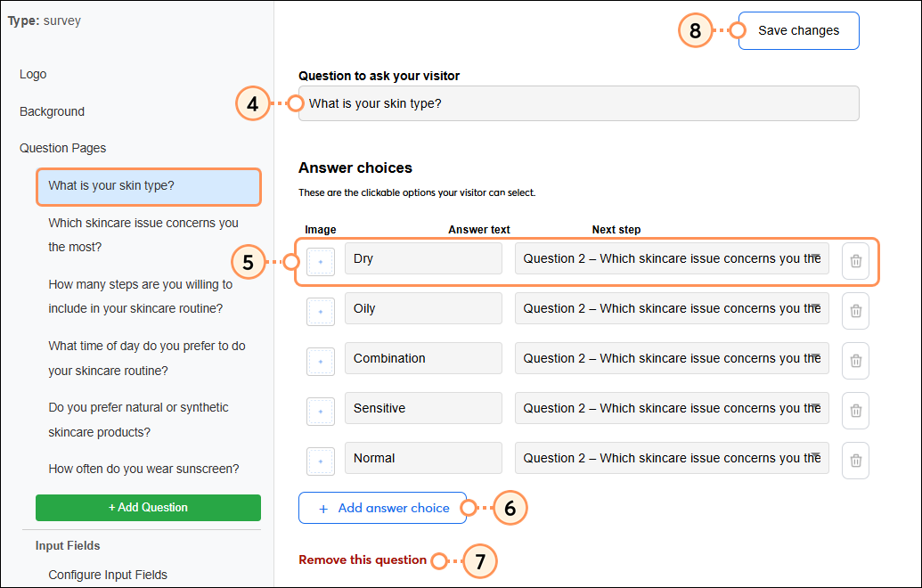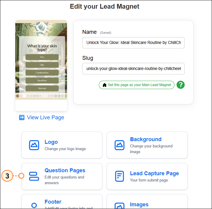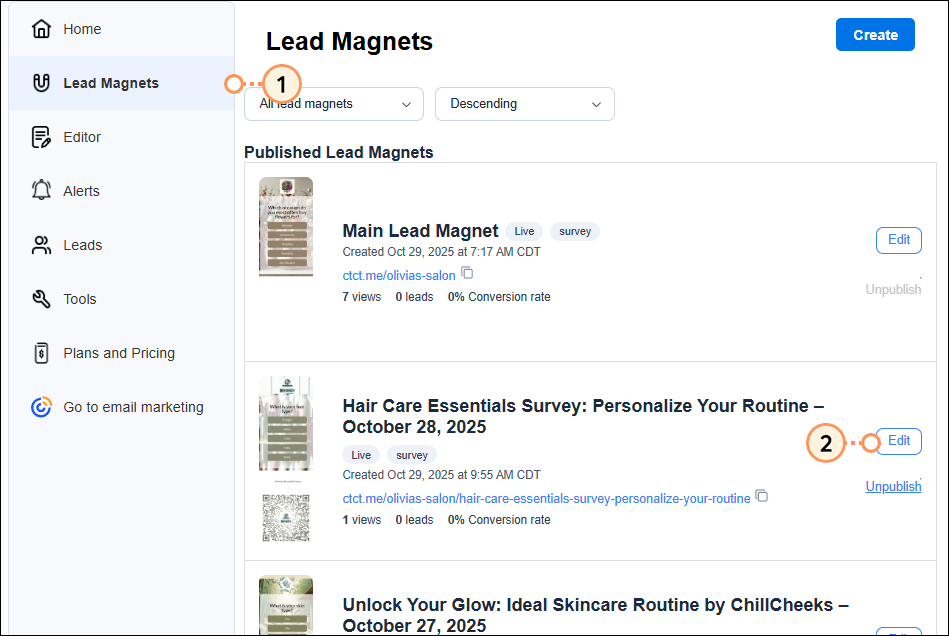 Edit the questions and answer choices on a Lead Magnet survey at any time. All changes you make will be saved automatically and published on your Lead Magnet page as you make them. If you make edits to survey questions after sharing your form, responses to previously added questions will be preserved.