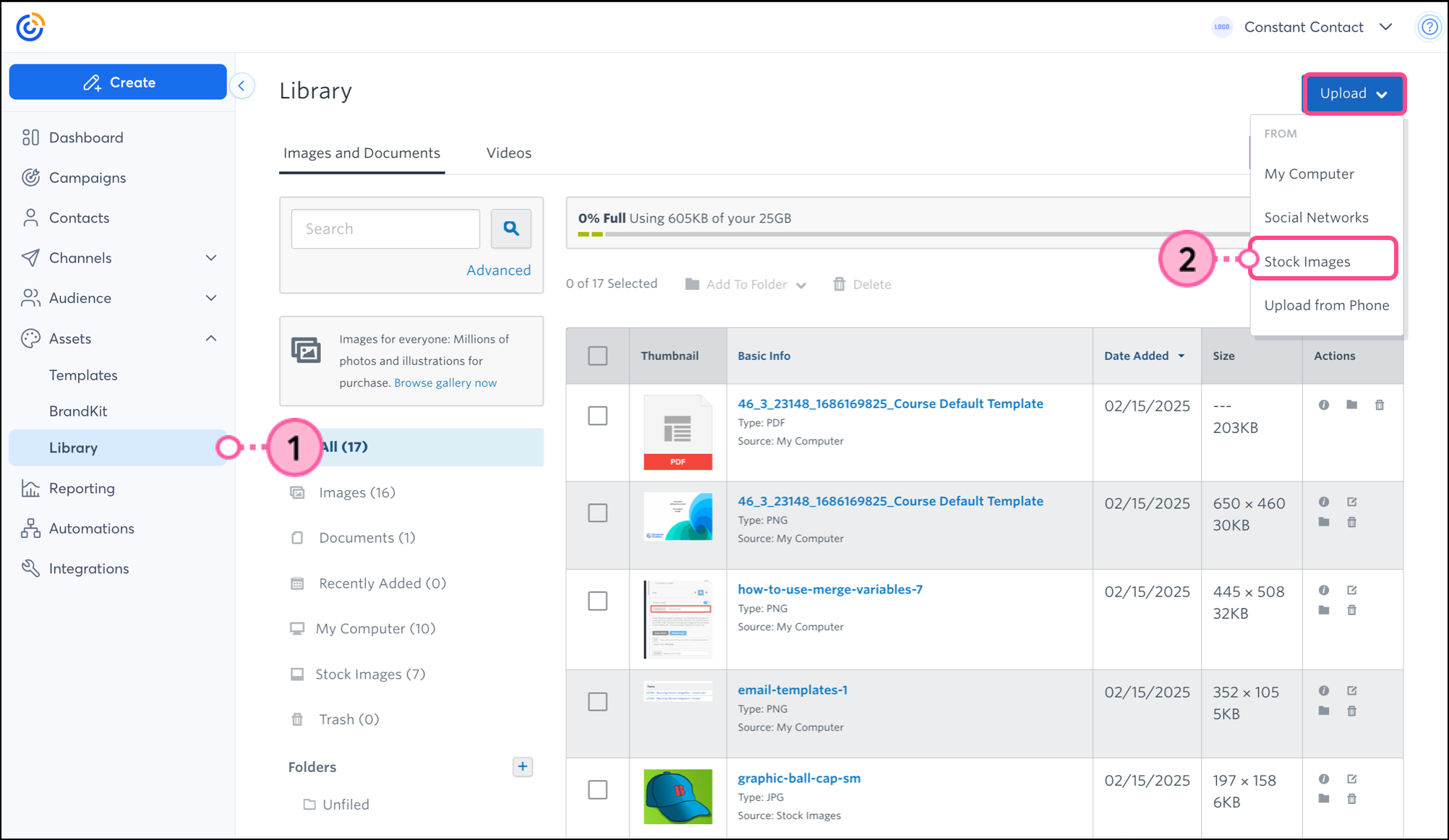 Constant Contact has integrated with Shutterstock to provide access to a stock image gallery with millions of professional-quality and royalty-free stock photos. Images are available for free or to purchase and can be added to the Library to be used in your emails, Events, Surveys, and Social campaigns.