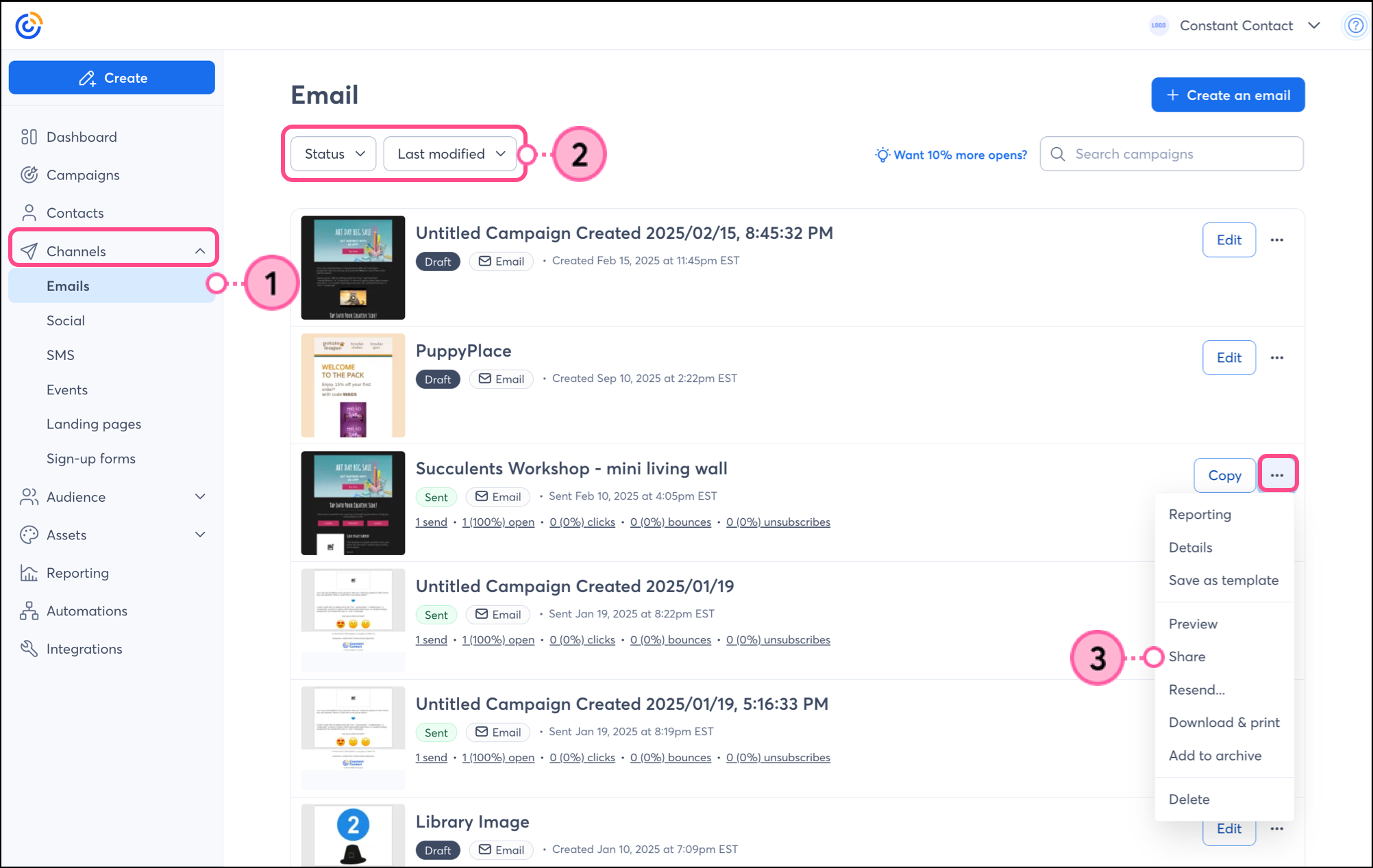 - Next to your published (sent) or scheduled email, click . . . > Share.