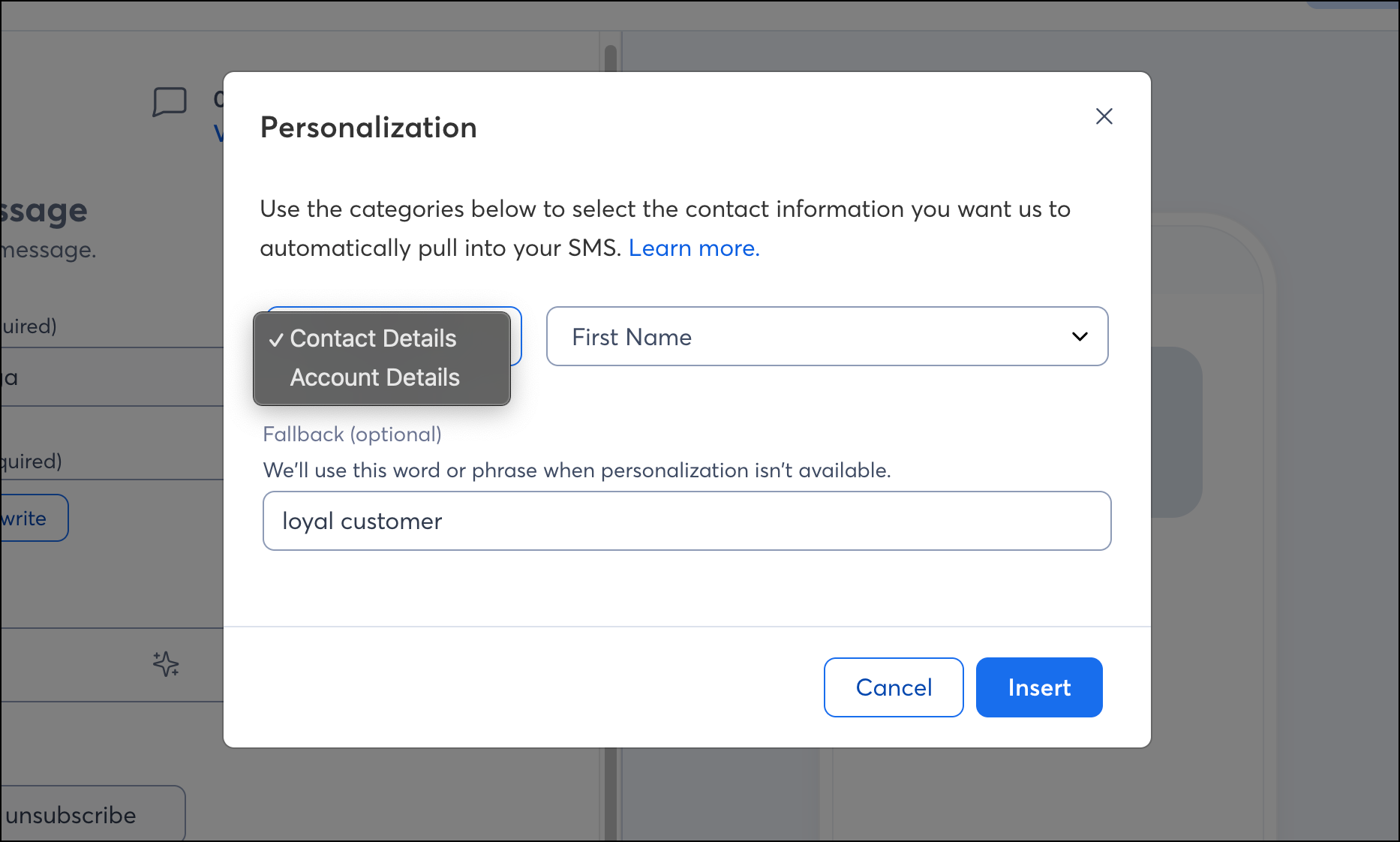 - Personalize - Click Personalize and select from a list of contact properties, like "First Name," and your own custom fields, or select from a list of account properties, like the "Organization name" or other account details. Next, add some fallback text to display when you don't have the information available for a contact, and then click the Insert button.