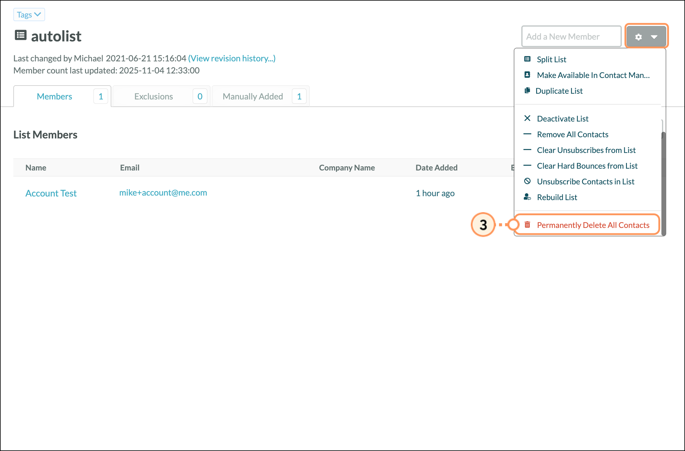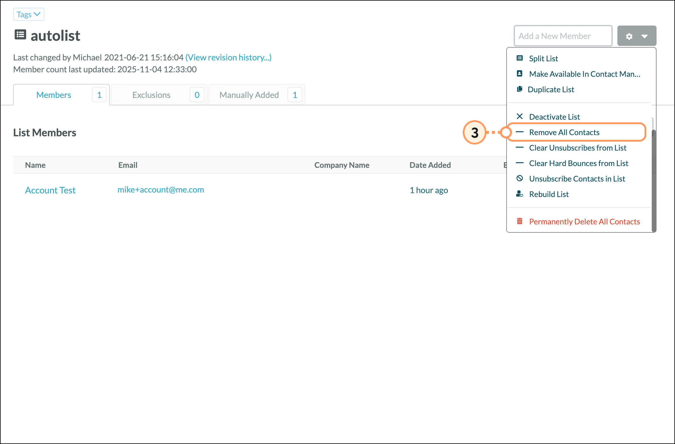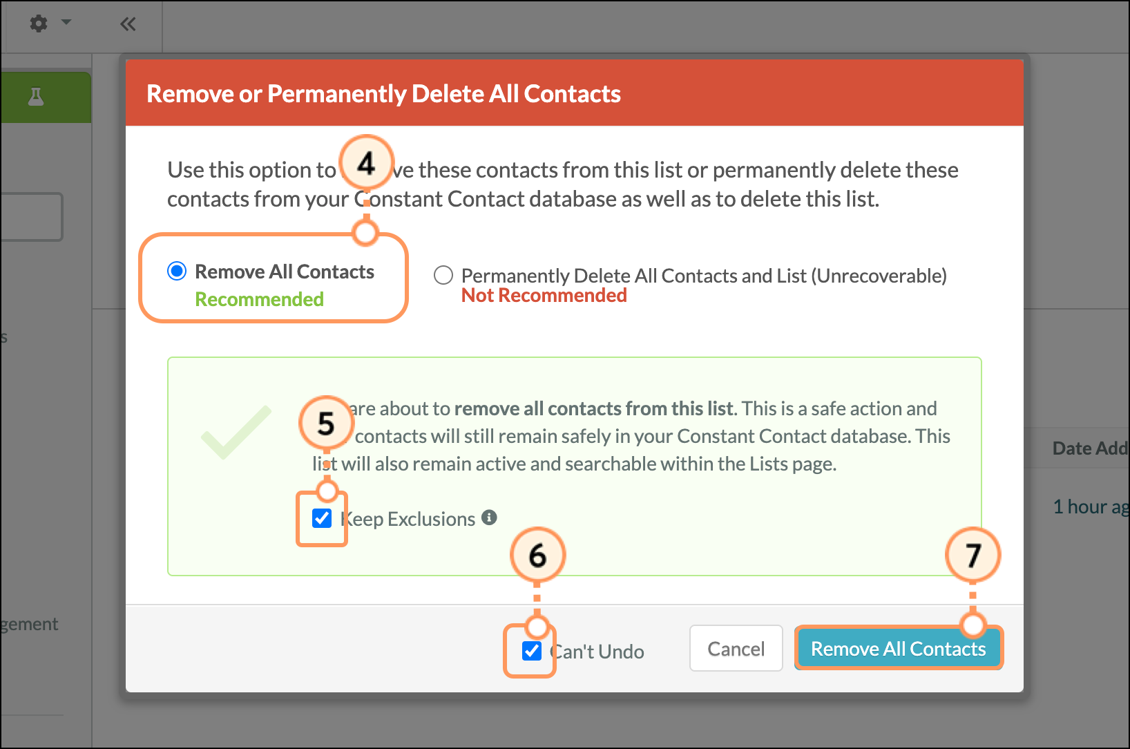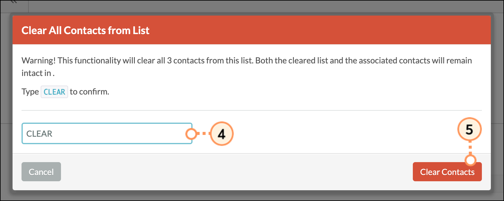 You can maintain list exclusions when you remove contacts from lists. This will remove all contacts from a list while keeping the cleared contacts and the associated list in the system. Be aware that the only available method to remove multiple contacts from a list in bulk is to remove all contacts at once.