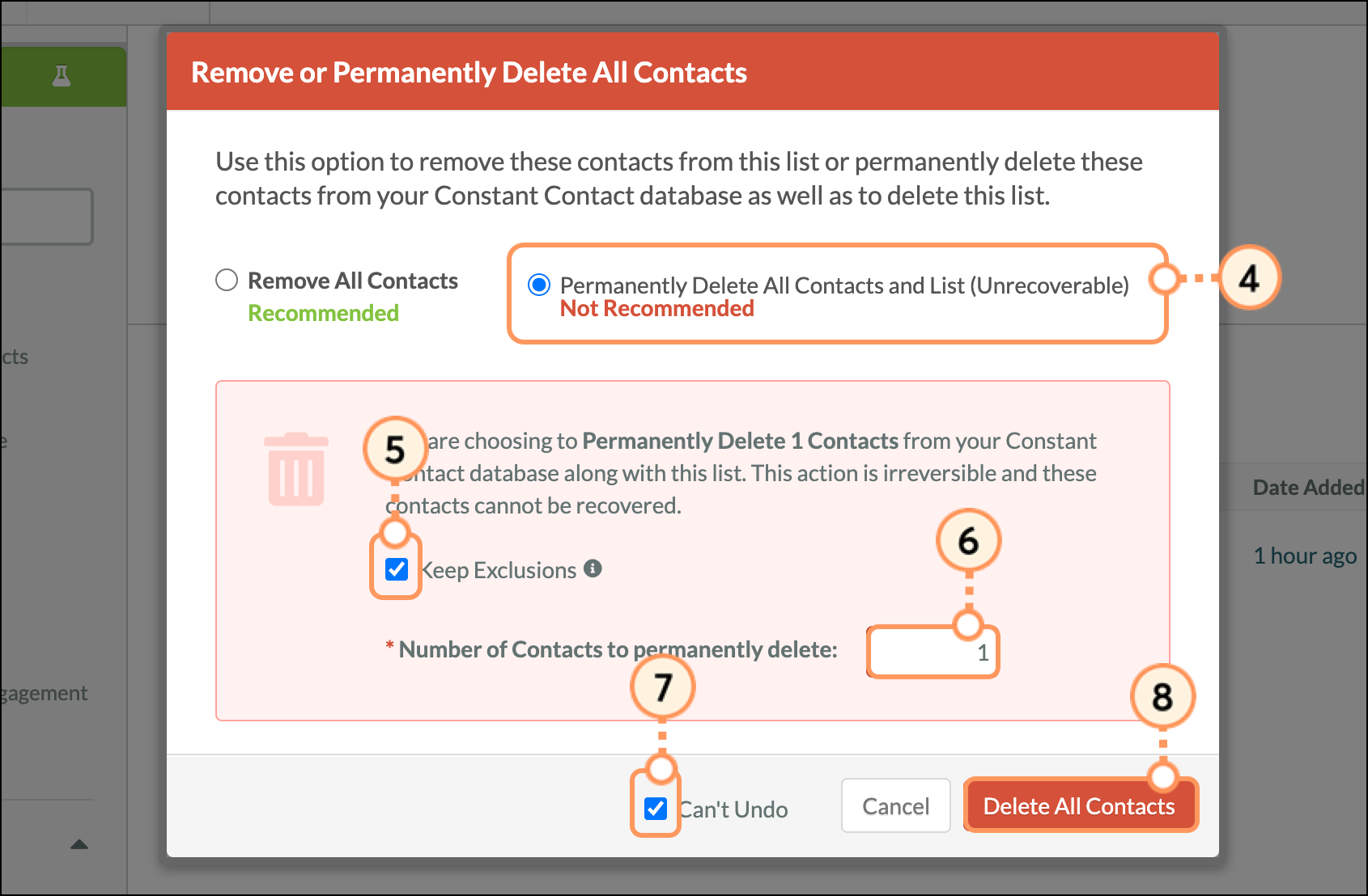 Depending on the option selected, you can permanently delete leads from your lists and your Constant Contact Lead Gen & CRM account, or you can restore them if you want to add them back to the list. This article will detail how to remove and restore list members.