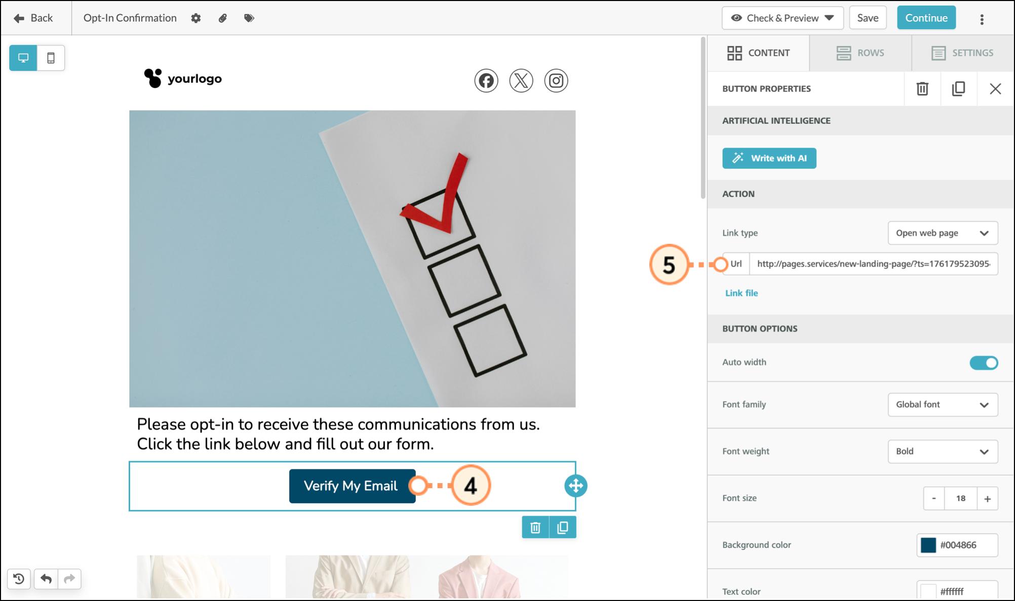 To create custom opt-in content, create a form or a native/third-party form. Once you have your opt-in form, create a landing page to host it, and send contacts to that the landing page via email.