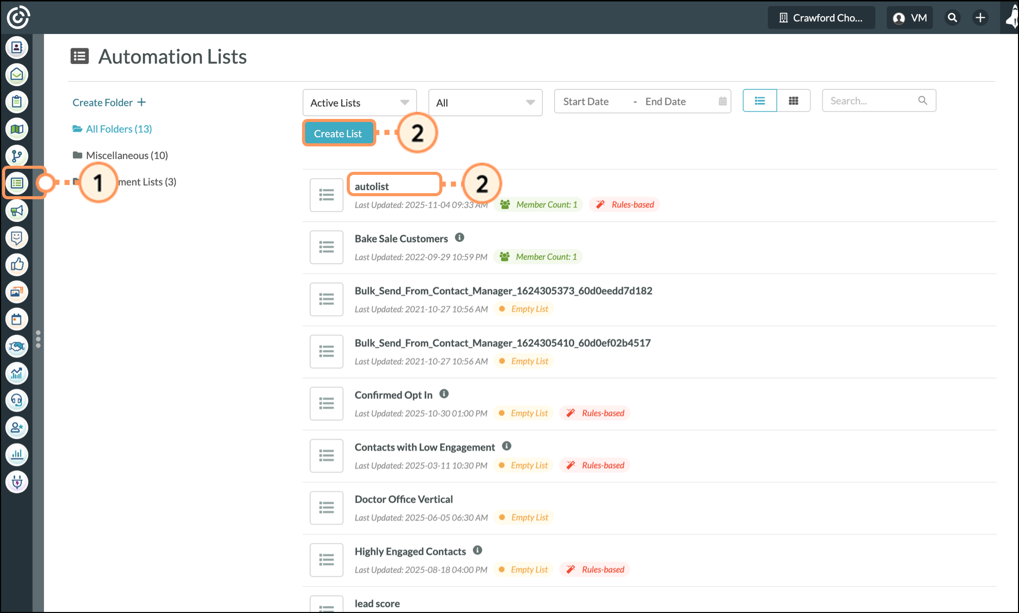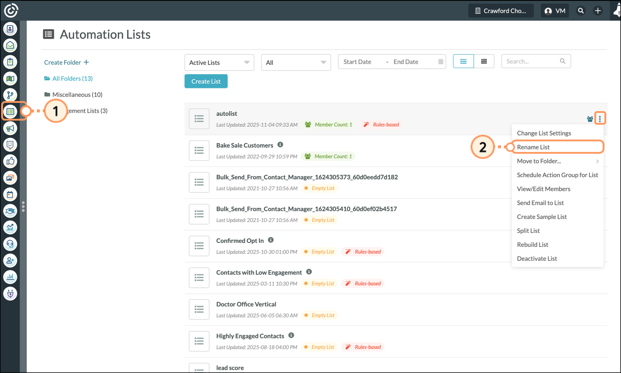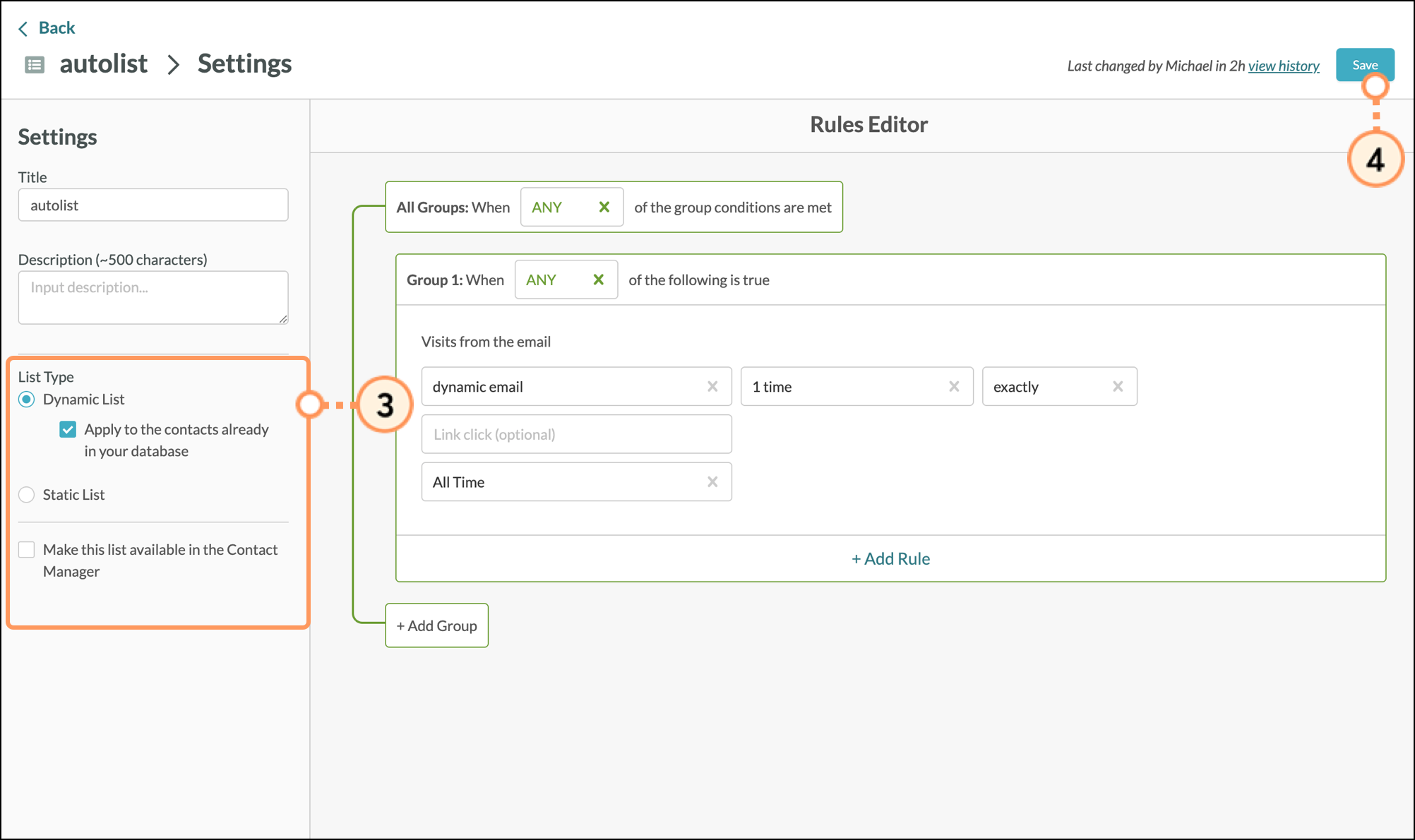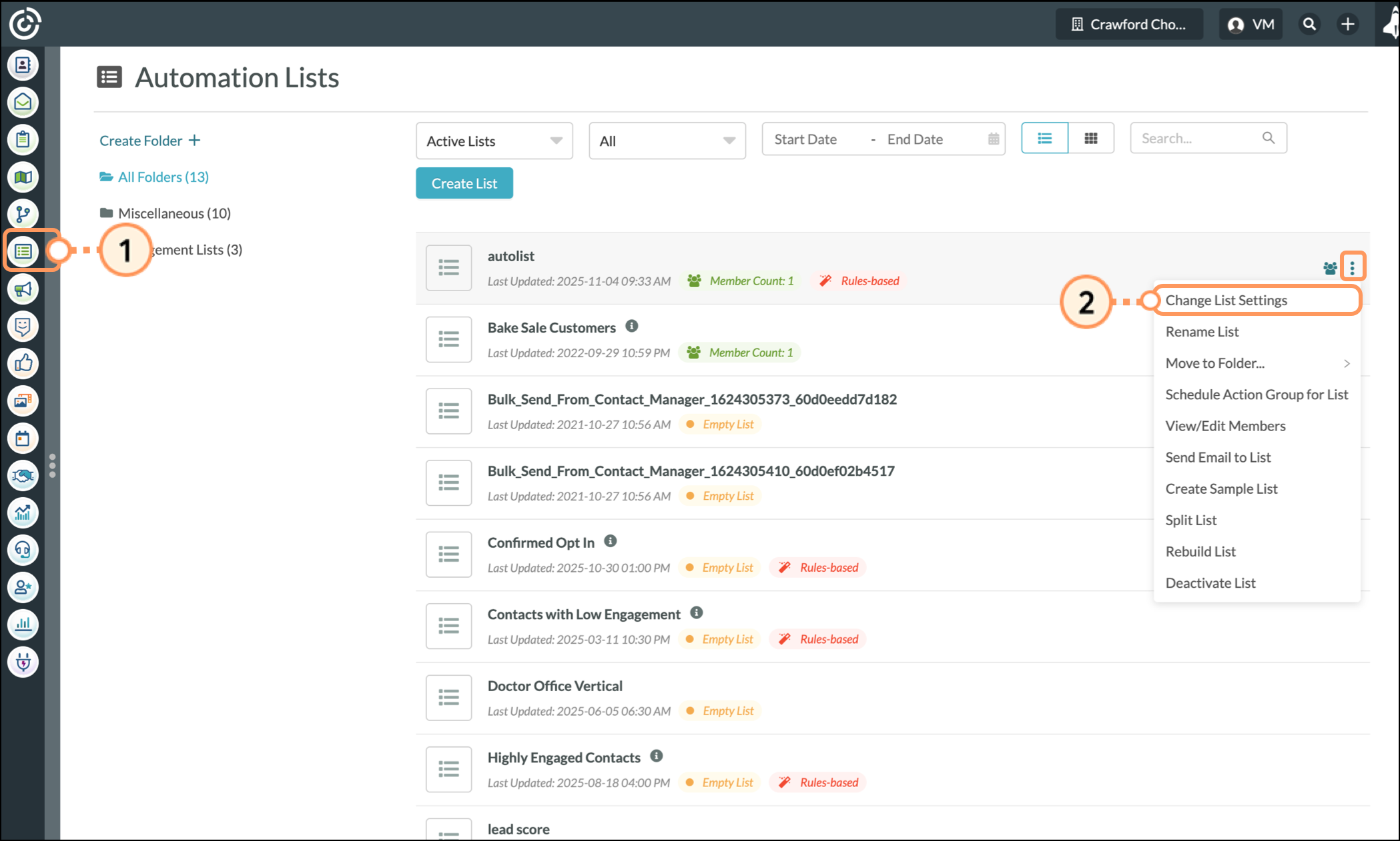 Be aware that engagement lists cannot be modified, as they are system lists. Similarly, manual lists do not have list settings, since they are not rules-based.