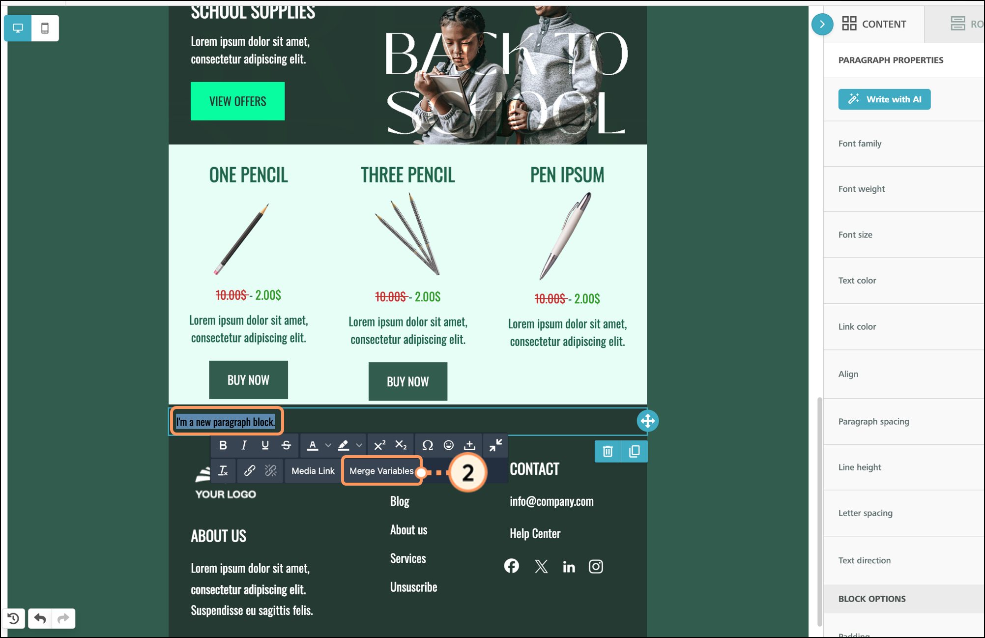 To add custom signatures to emails in the new email editor, create or edit an email from the Email page in the left toolbar.