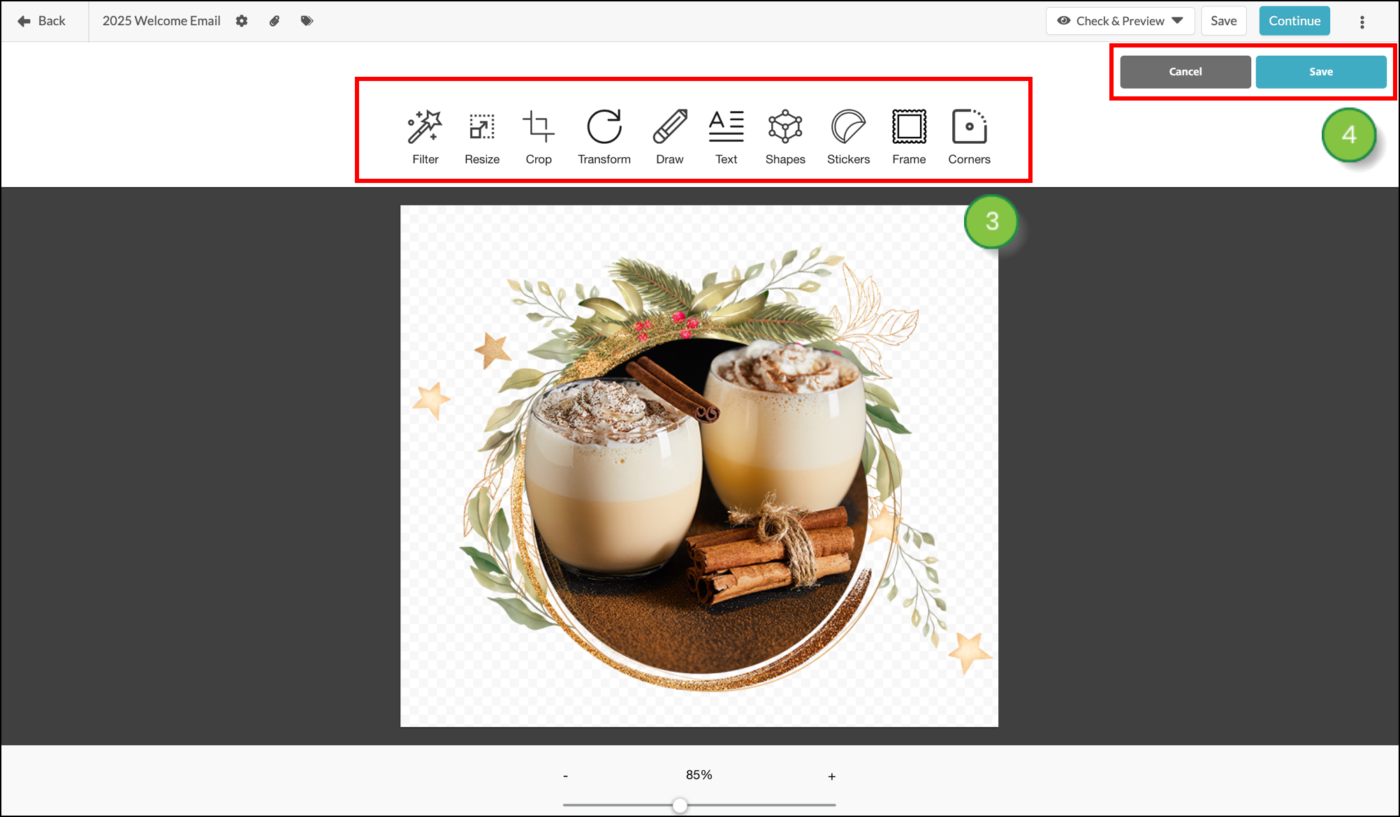 Edit your image using built-in editing tools. Add a filter, resize, crop, or frame your image right from the email editor.