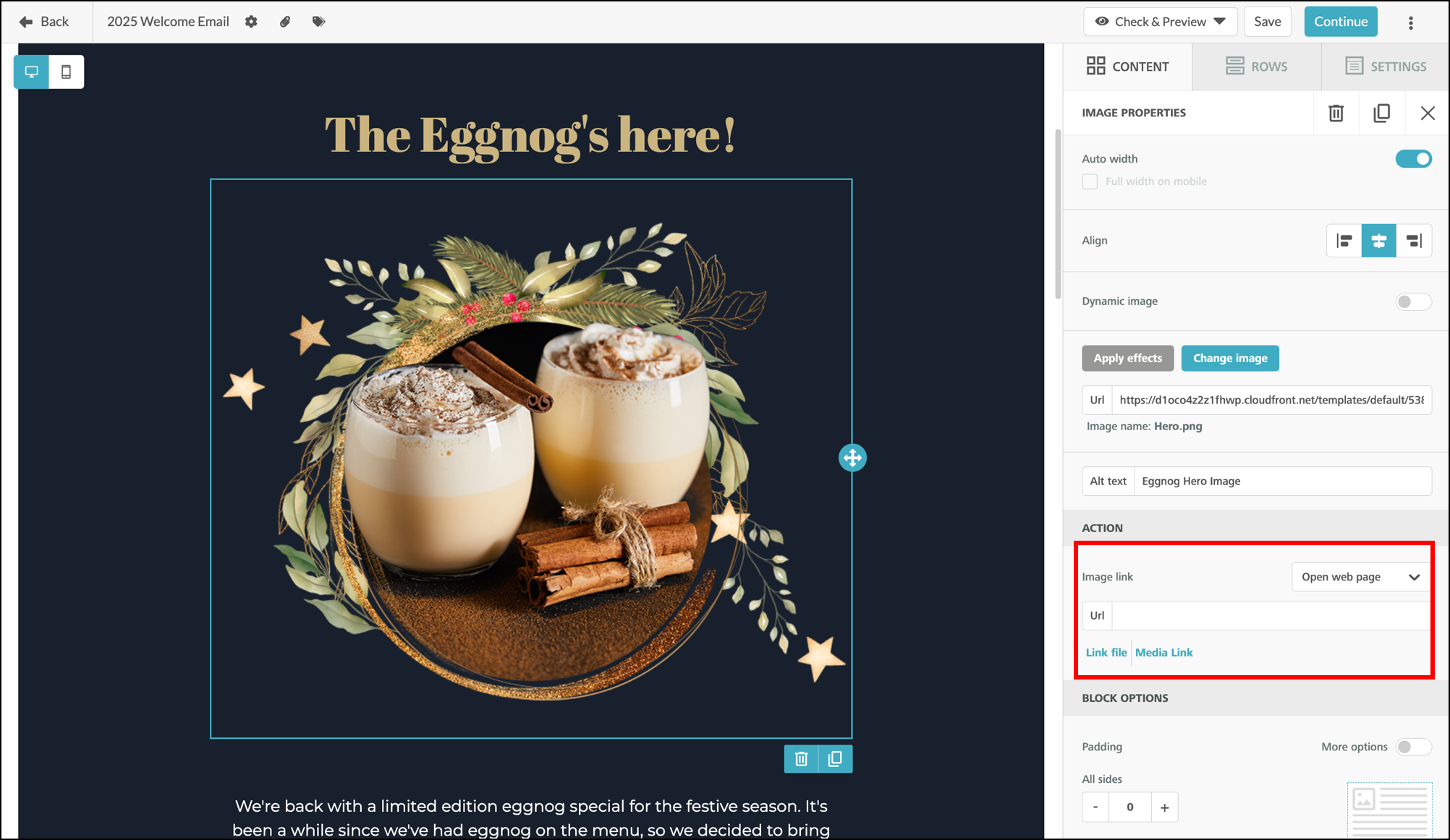 In the Action section, you can turn your image into a link. Using the drop-down menu, select the action that occurs once the customer clicks on the image. The available actions are: