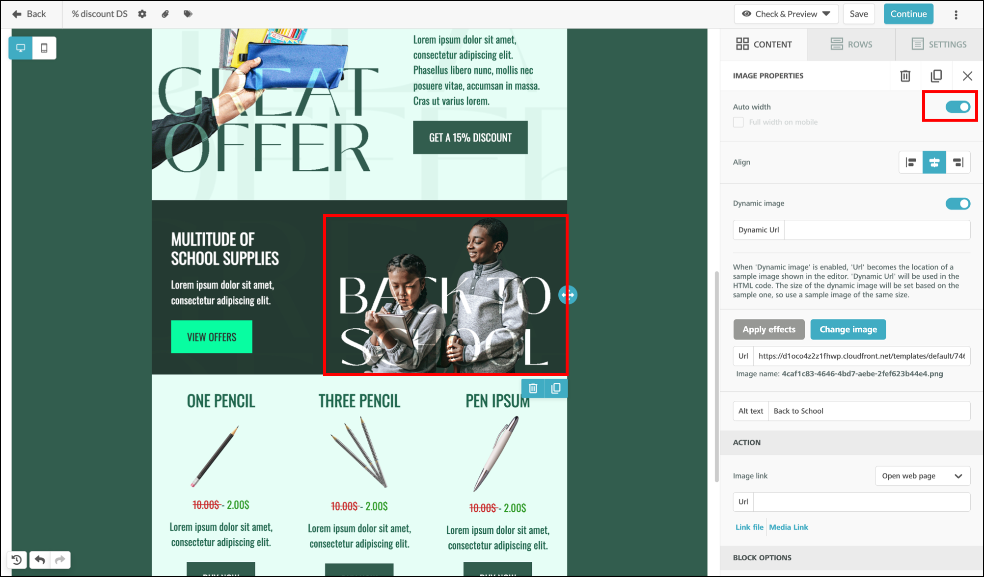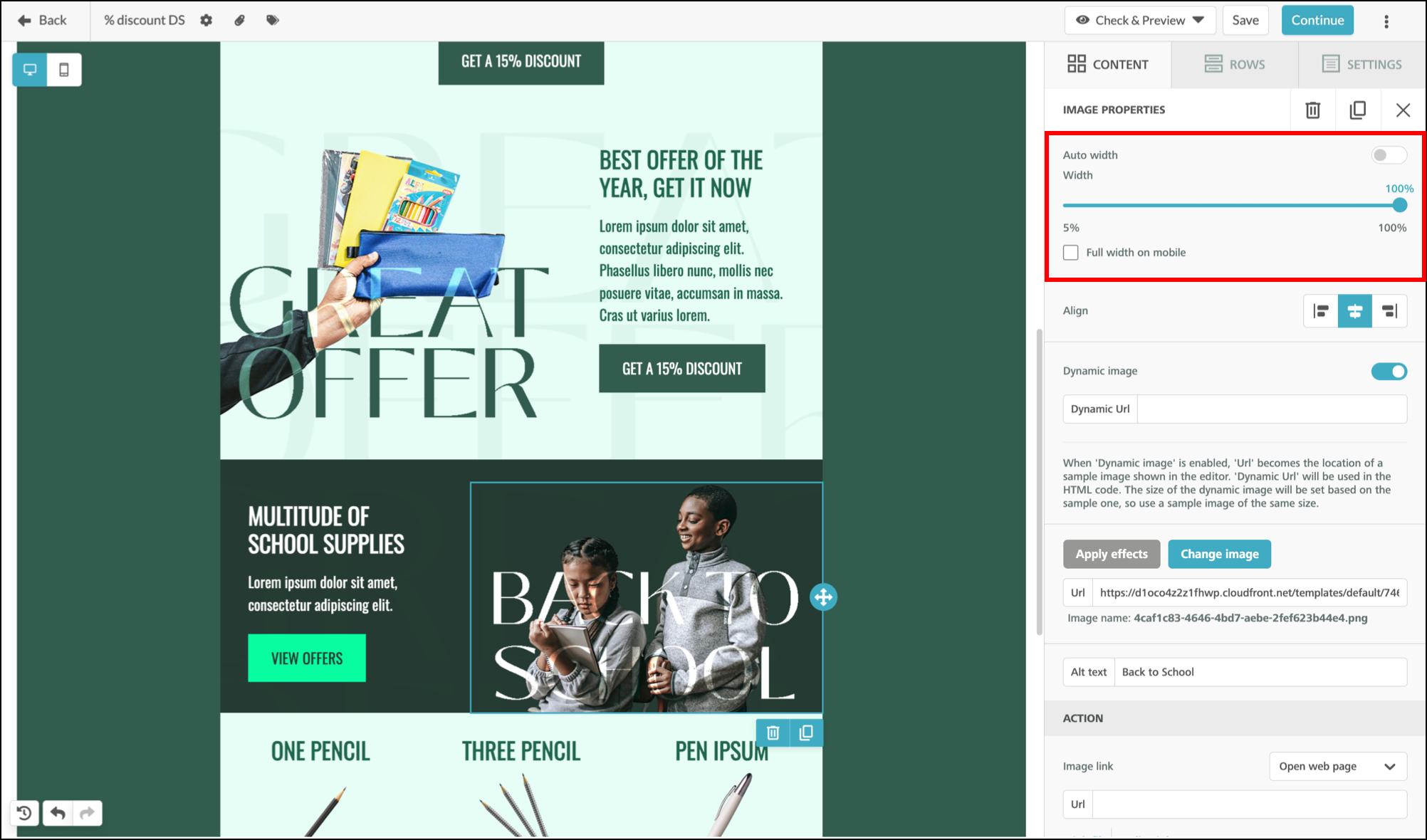 After Auto width is off, use the slider to adjust your image's width. This slider is relative to the size of your image file. If the slider is at 100% width but the image is still too small, resize the image in your preferred image editor and then upload it again, or use the image editing tools within the Lead Gen email editor by clicking "Apply Effects".