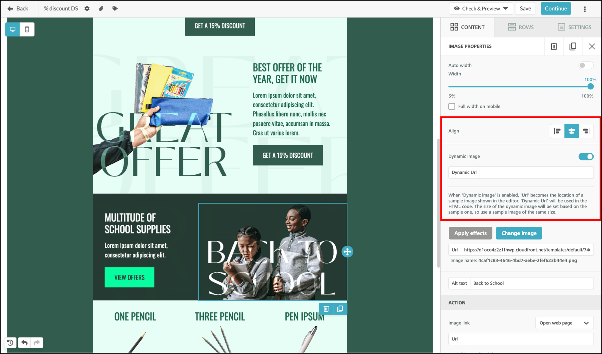 Align your image left, center, or right as needed using the align buttons and enable or disable Dynamic image.