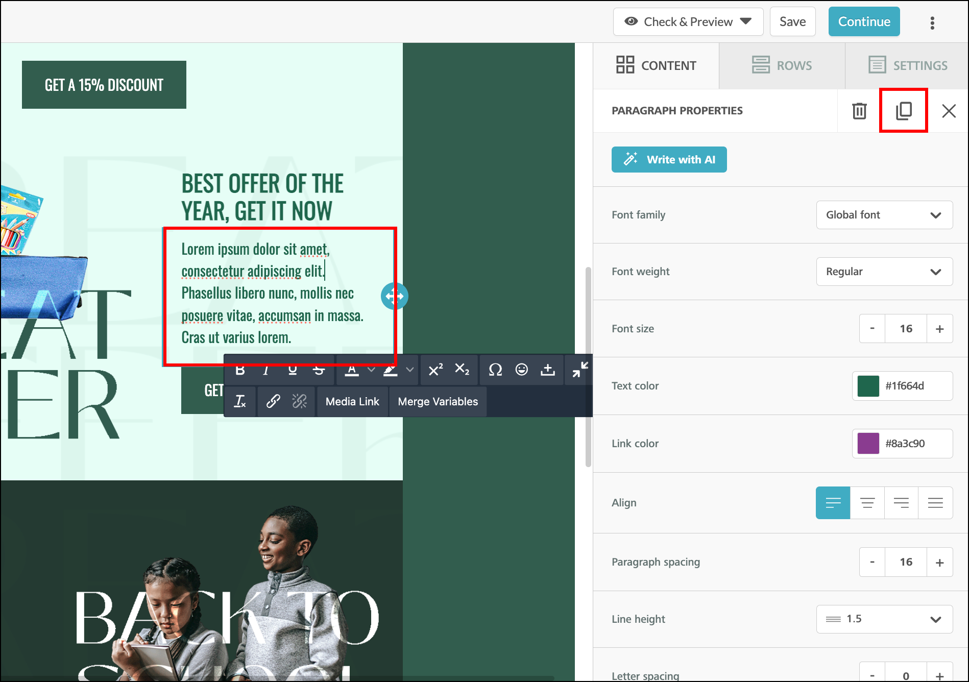 Tap the text block and then tap the Duplicate button in the top right corner of the email editor.