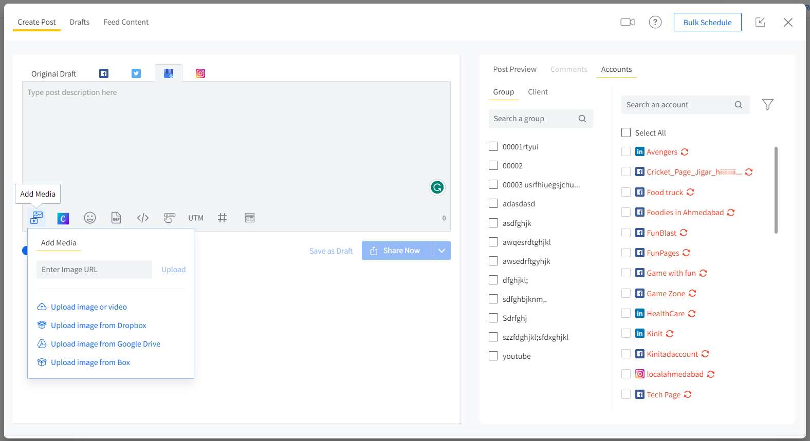 You can upload images from your local device, Google Drive, Dropbox, or Box by clicking on Add Media and going for the preferred source.