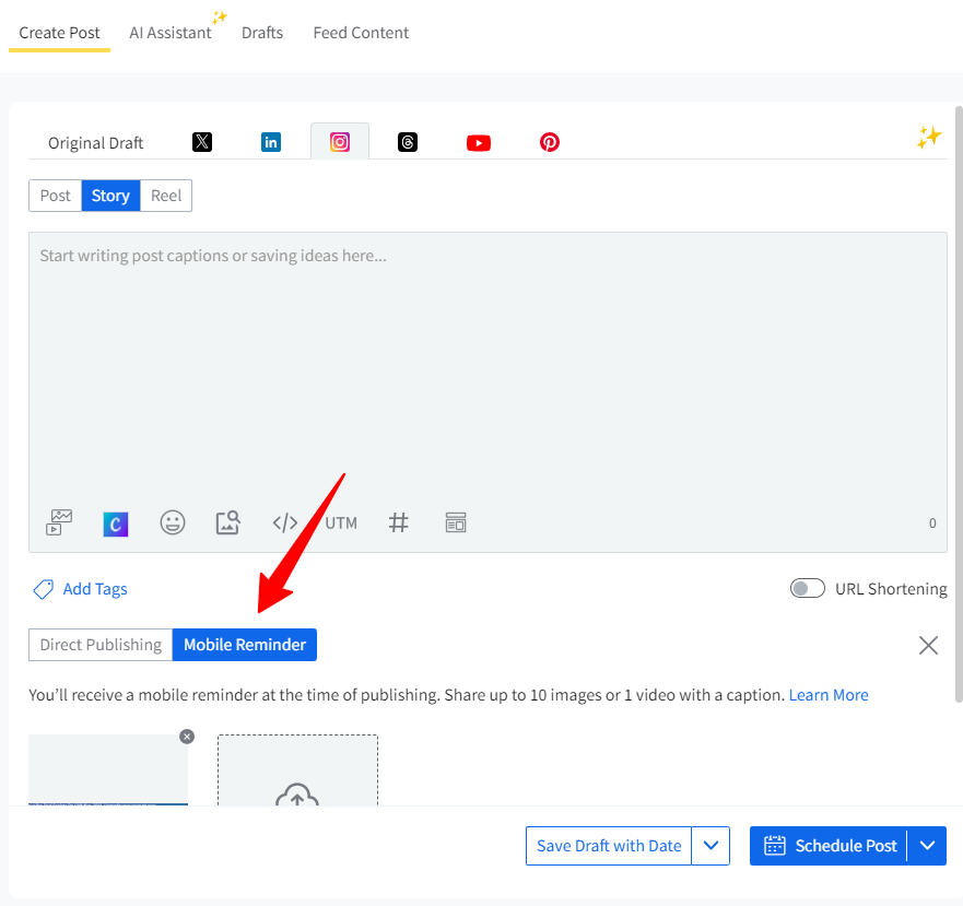 For Instagram Personal accounts, direct publishing is not supported. Instead, Ready Social offers mobile reminders for posting.