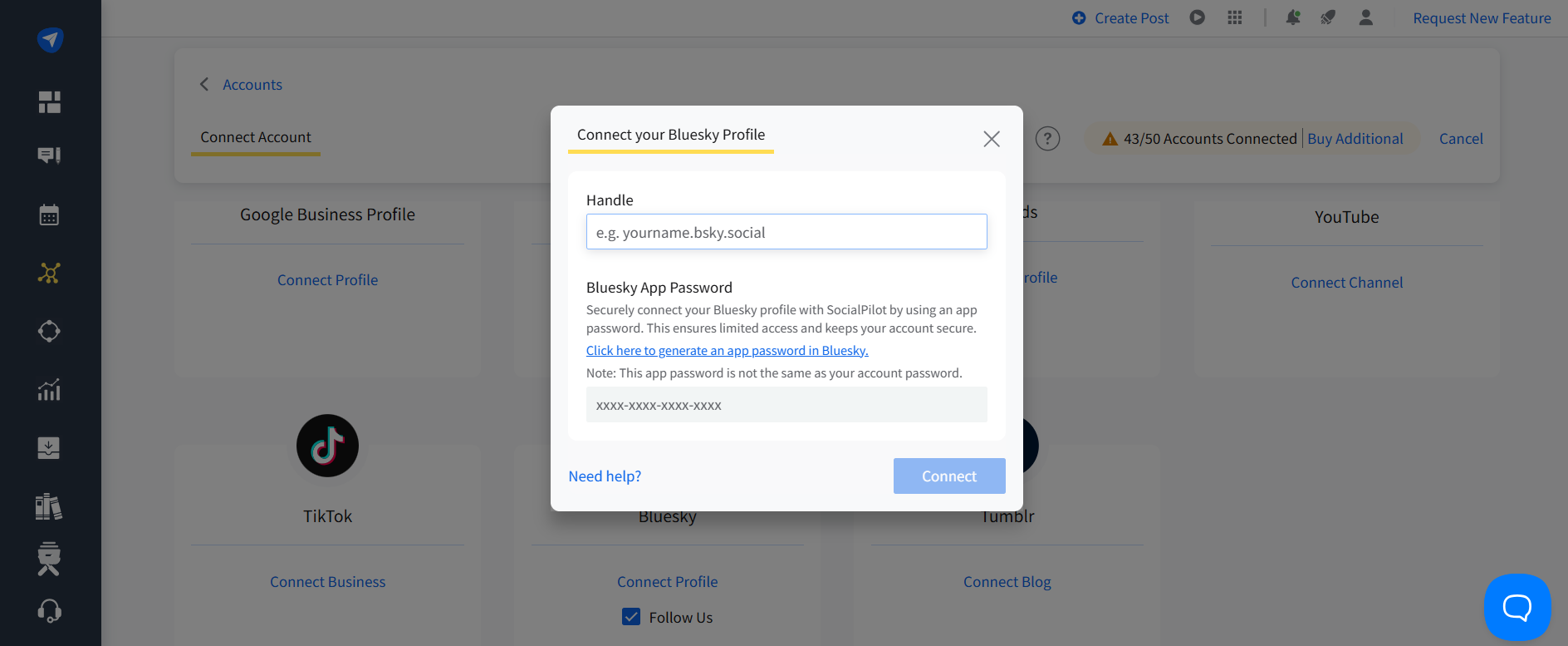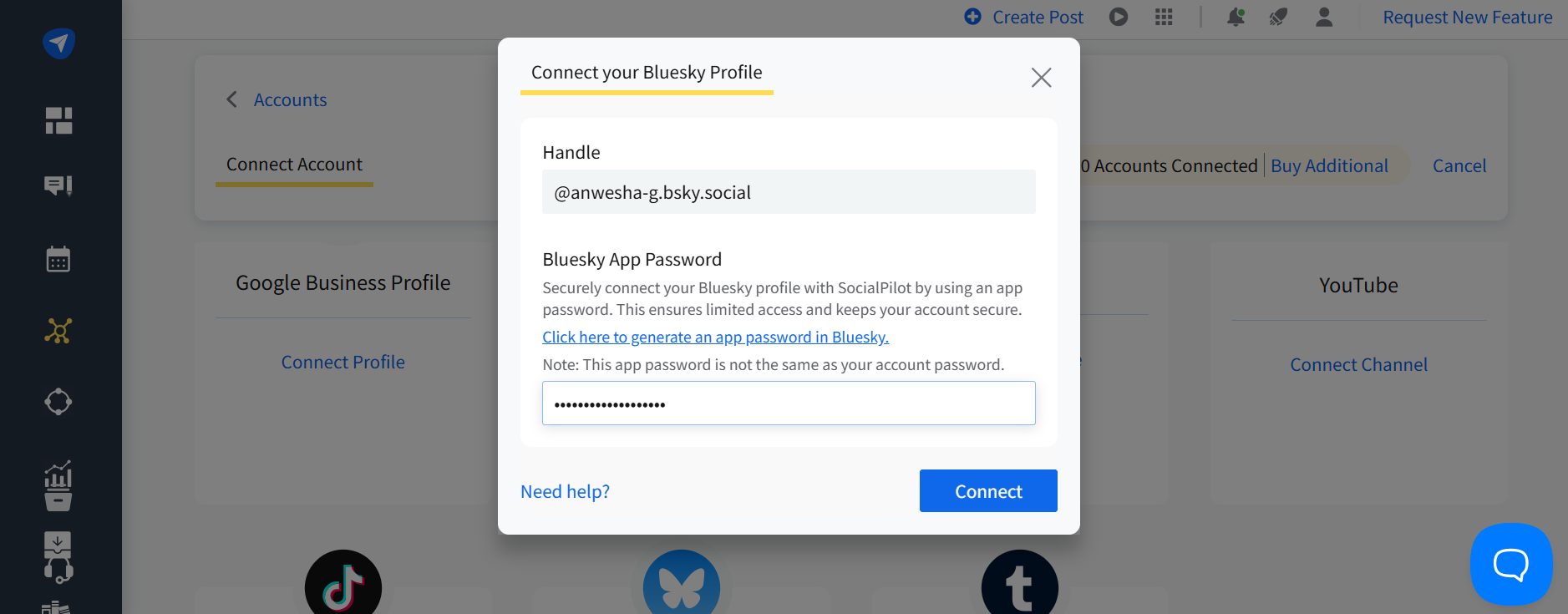 Once the Bluesky connection modal opens up, add your handle to the relevant field.
