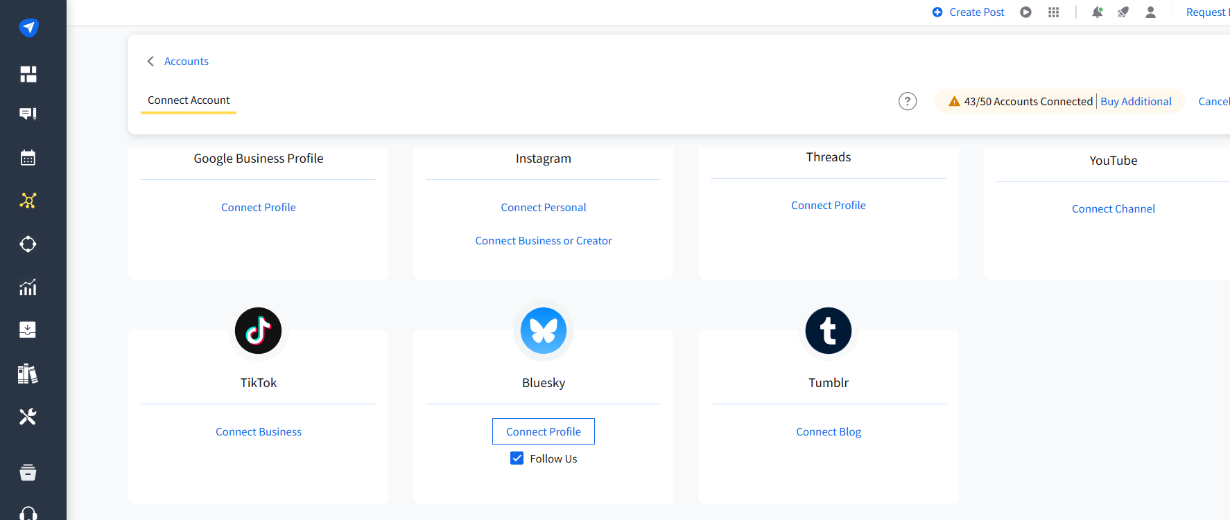 The process of connecting a Bluesky account to your Ready Social account is a little different from the way you connect your other social media accounts. We will guide you through the process in a few simple steps.