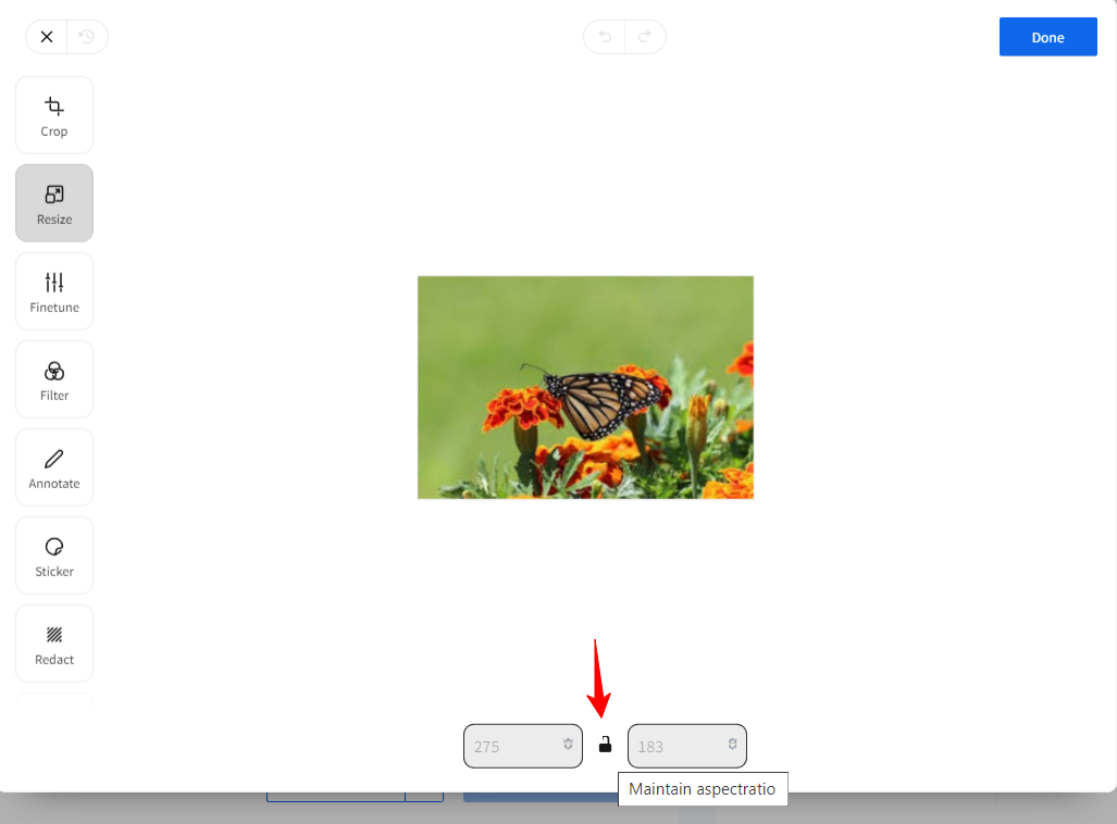 Select the Resize option from the left-hand side menu below the Crop tool. The current width and height of the image will be displayed at the bottom of the image preview.