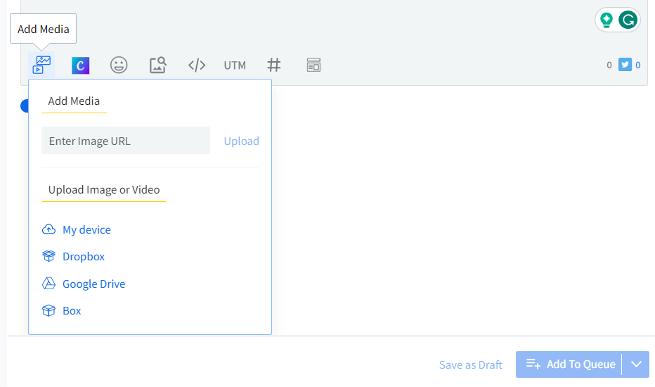 You can upload images or videos from various sources, including your local device or via Google Drive, Dropbox, or Box.