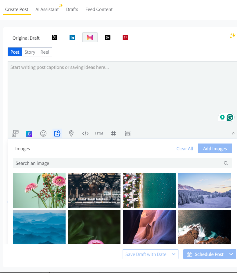 Alternatively, you can use stock images from Unsplash integration. Simply click Add Media from External Source, search for suitable images or videos, and select them to add to your post.