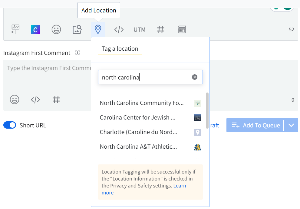 You can schedule a First Comment to accompany your post, allowing you to keep the caption clean while placing additional hashtags or details in the comment. Add your first comment in the designated box below the caption field.