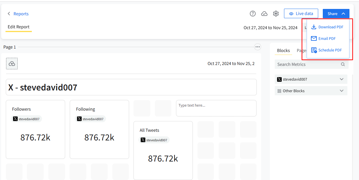 Click on "Live Data" to see the report in its final PDF format. This opens a new tab, allowing you to ensure everything is properly aligned and formatted before sharing.