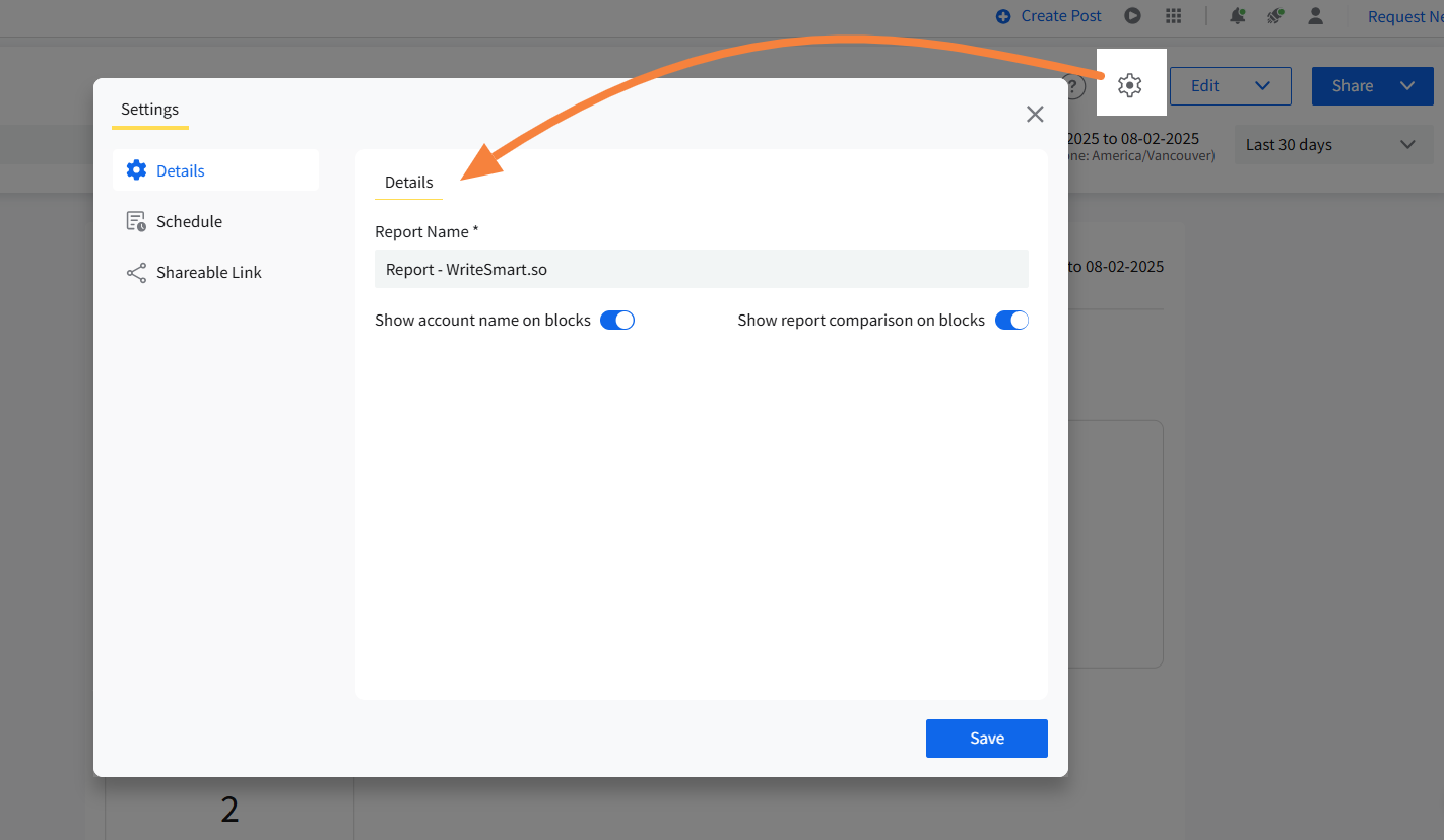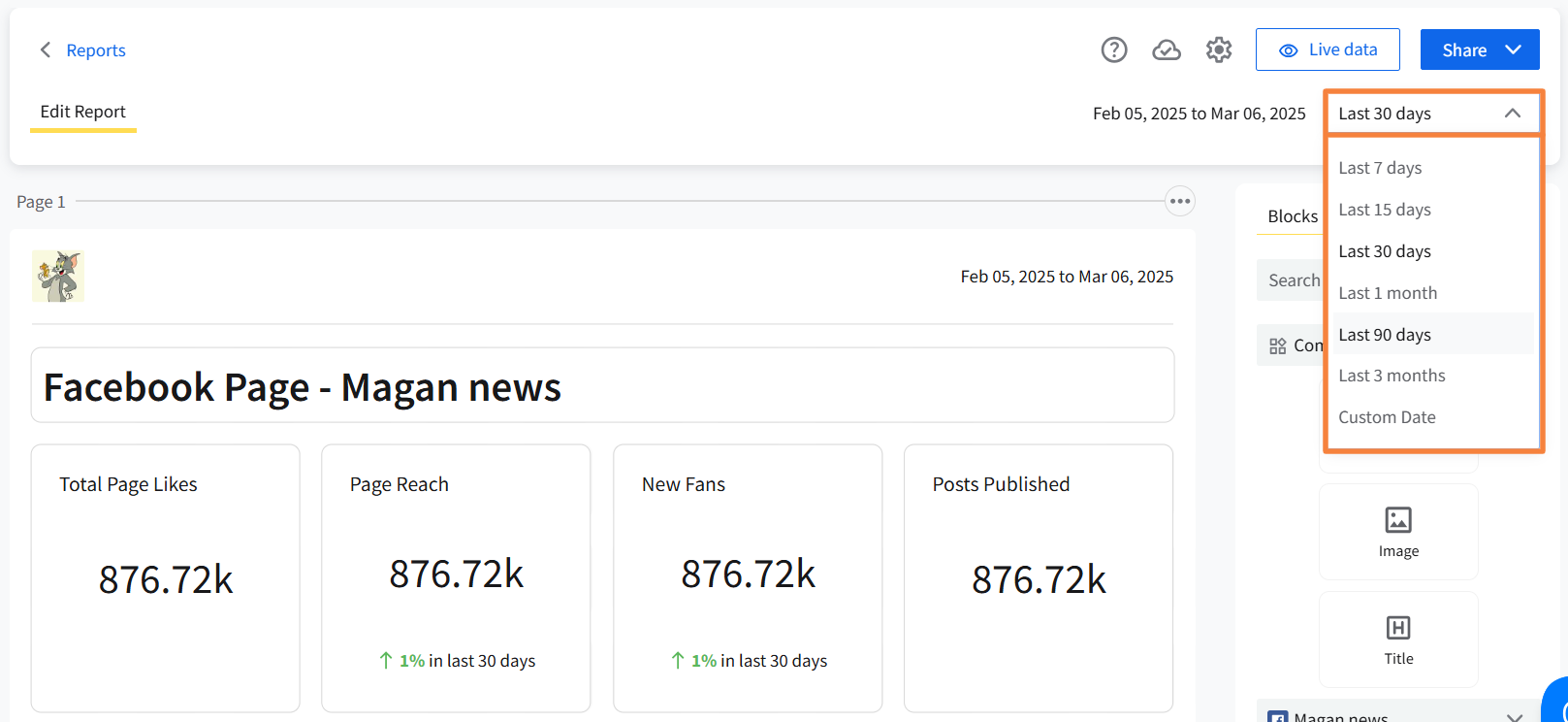 First and foremost, you must select the time period the report will cover. To customize the date range of the report, select the date drop-down below the Share button and choose the required option.