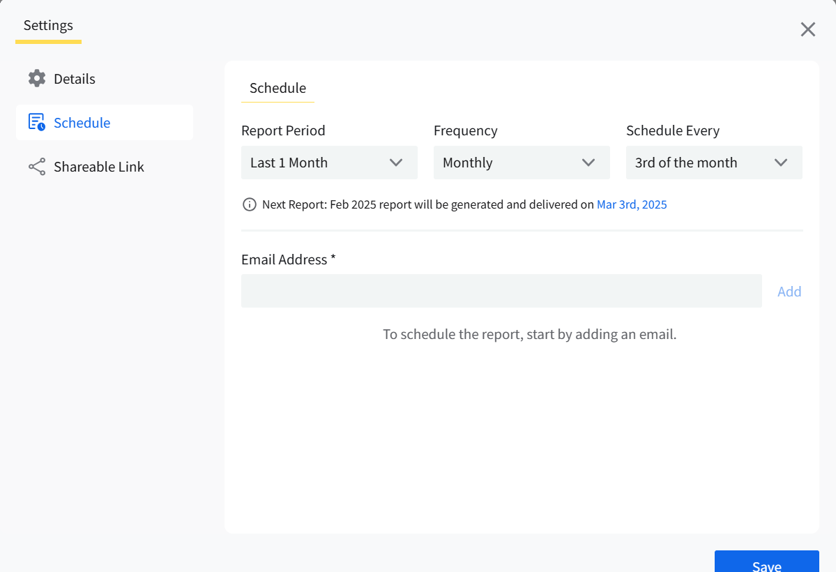 Schedule: Set up the automatic sharing of the report to multiple people periodically by scheduling it.